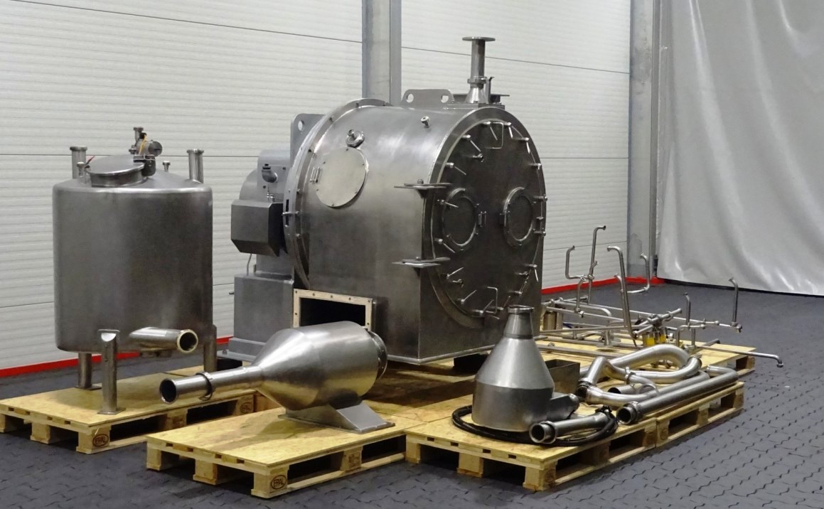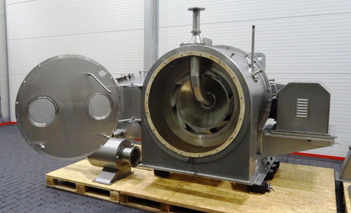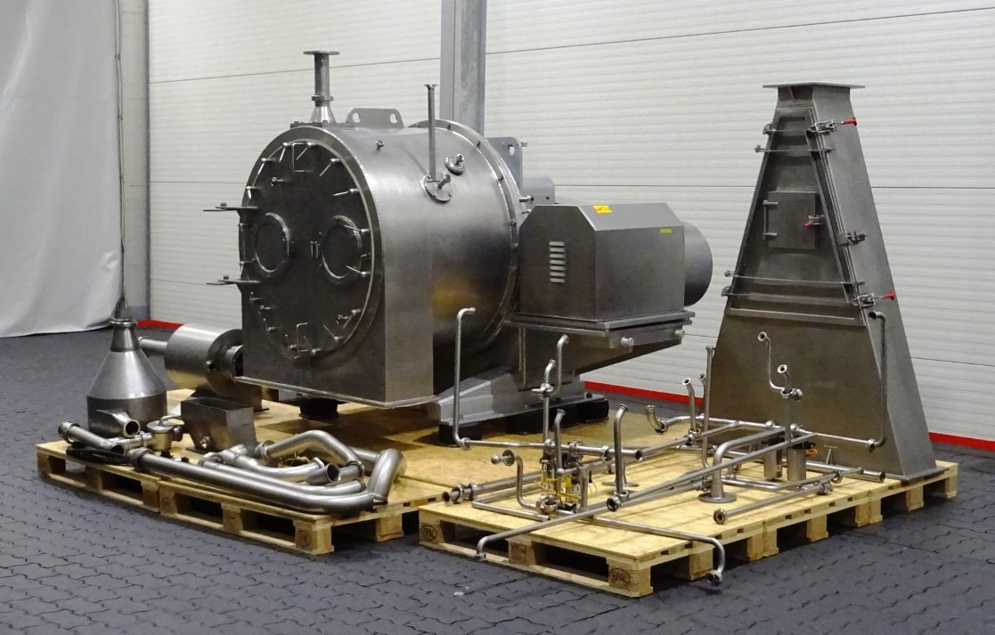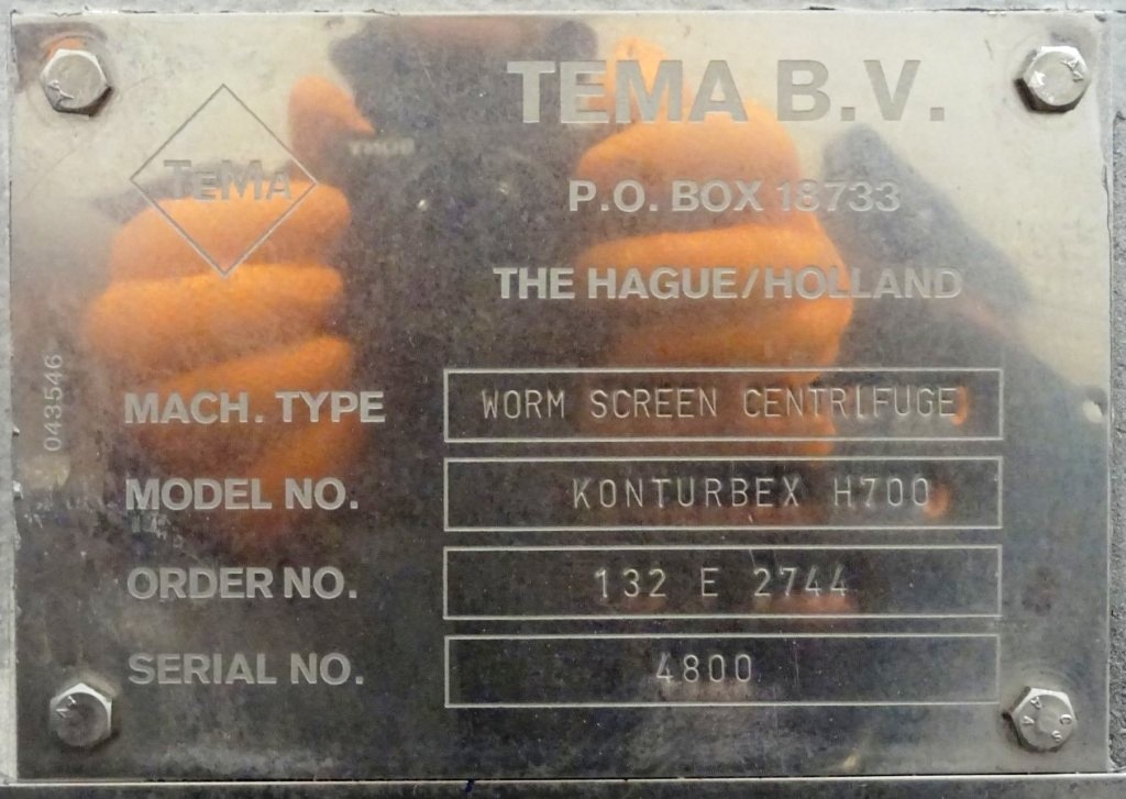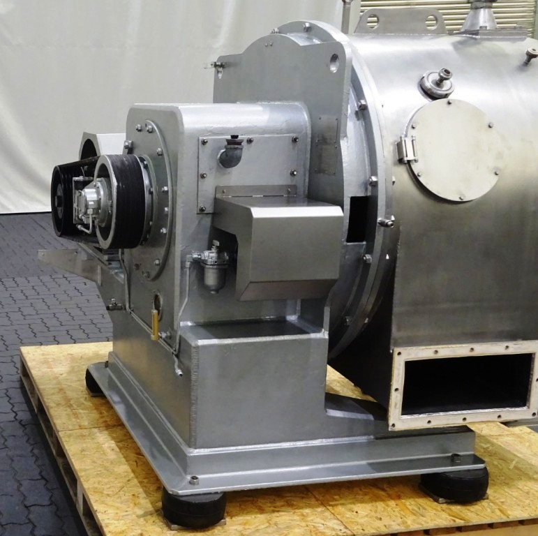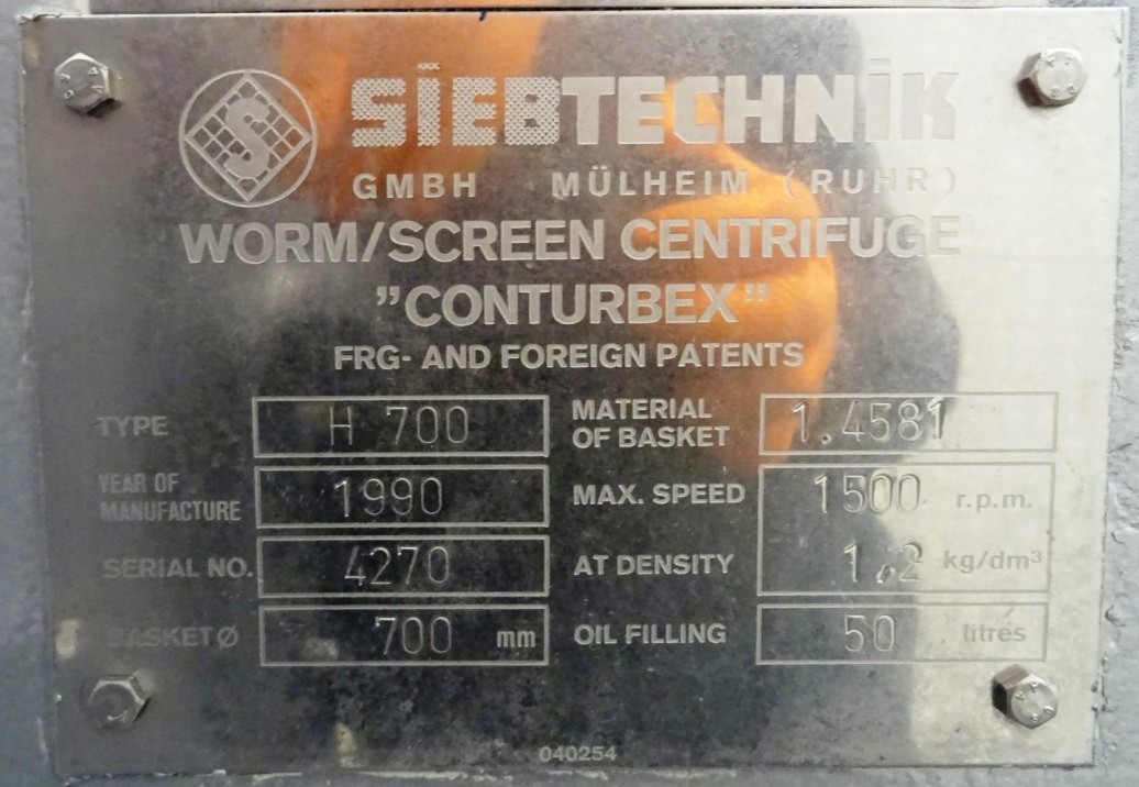 The Siebtechnik Tema H-700 Conturbex centrifuge, 1.4581 SS. is engineered for high-efficiency solid-liquid separation, making it an ideal choice for various industrial applications, particularly in the dairy and food processing sectors. With a maximum bowl speed of 1500 RPM and a rated capacity of 350 GPM, this centrifuge is capable of handling up to 40 TPH of solids. The design features an innovative 10-degree bowl angle and eight flights that facilitate optimal separation performance, ensuring that the solids are effectively dewatered while maintaining the integrity of the liquid phase. The inclusion of holes for washing enhances the cleaning process, allowing for minimal downtime between batches and ensuring consistent product quality.