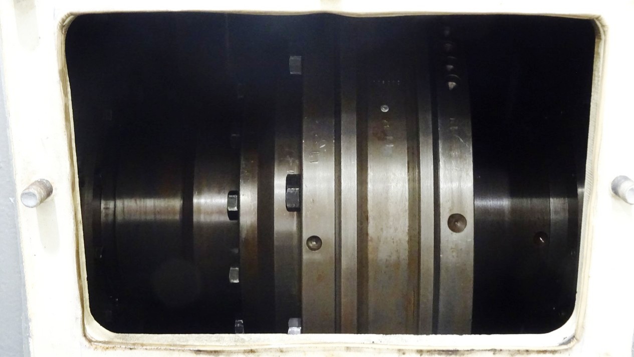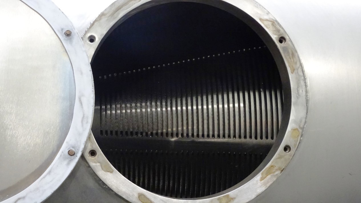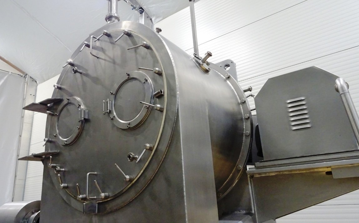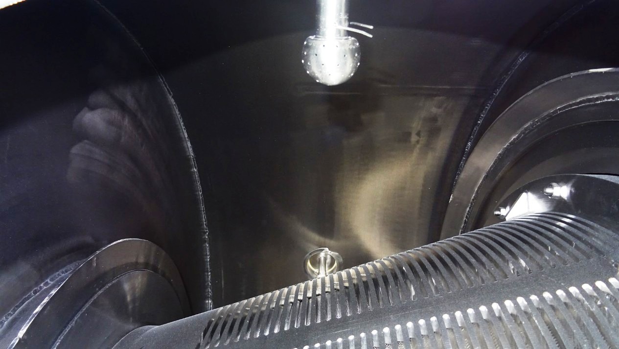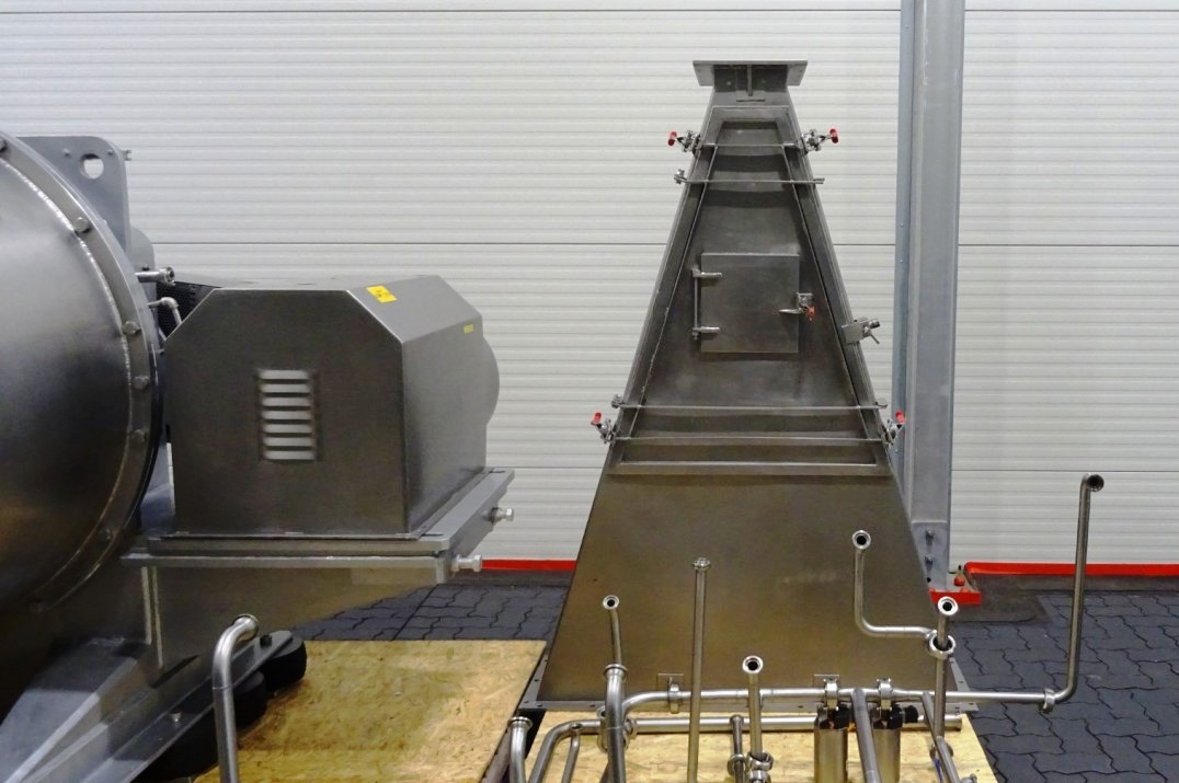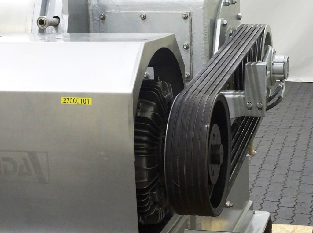 The Siebtechnik Tema H-700 Conturbex centrifuge, 1.4581 SS. is engineered for high-efficiency solid-liquid separation, making it an ideal choice for various industrial applications, particularly in the dairy and food processing sectors. With a maximum bowl speed of 1500 RPM and a rated capacity of 350 GPM, this centrifuge is capable of handling up to 40 TPH of solids. The design features an innovative 10-degree bowl angle and eight flights that facilitate optimal separation performance, ensuring that the solids are effectively dewatered while maintaining the integrity of the liquid phase. The inclusion of holes for washing enhances the cleaning process, allowing for minimal downtime between batches and ensuring consistent product quality.
