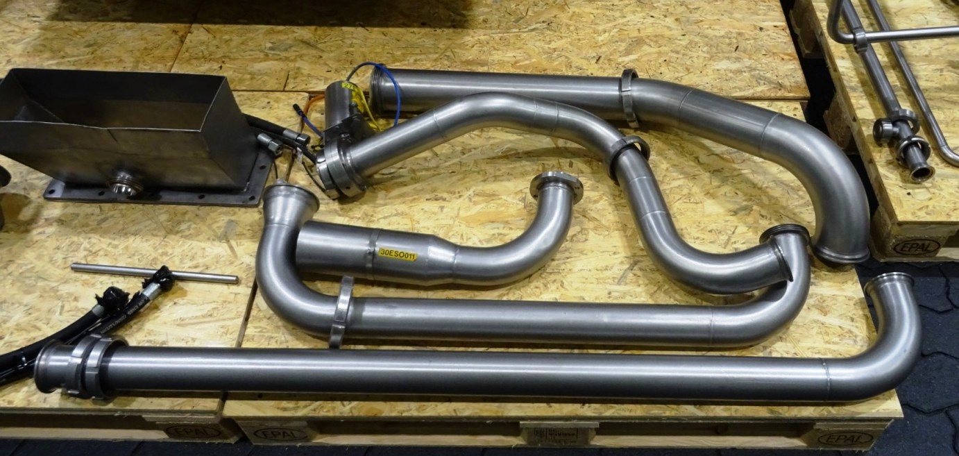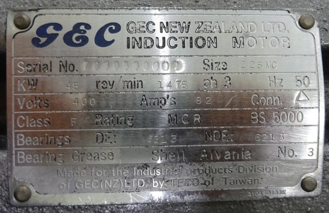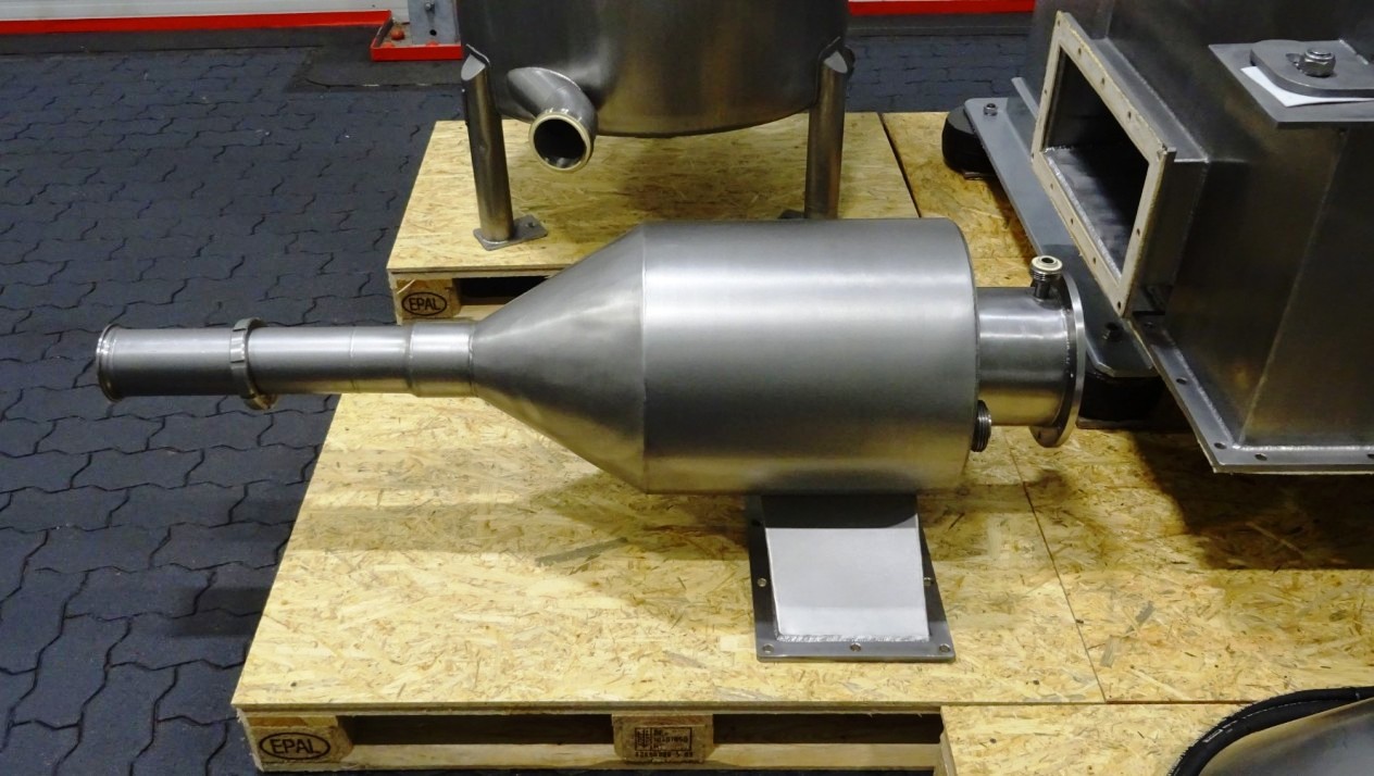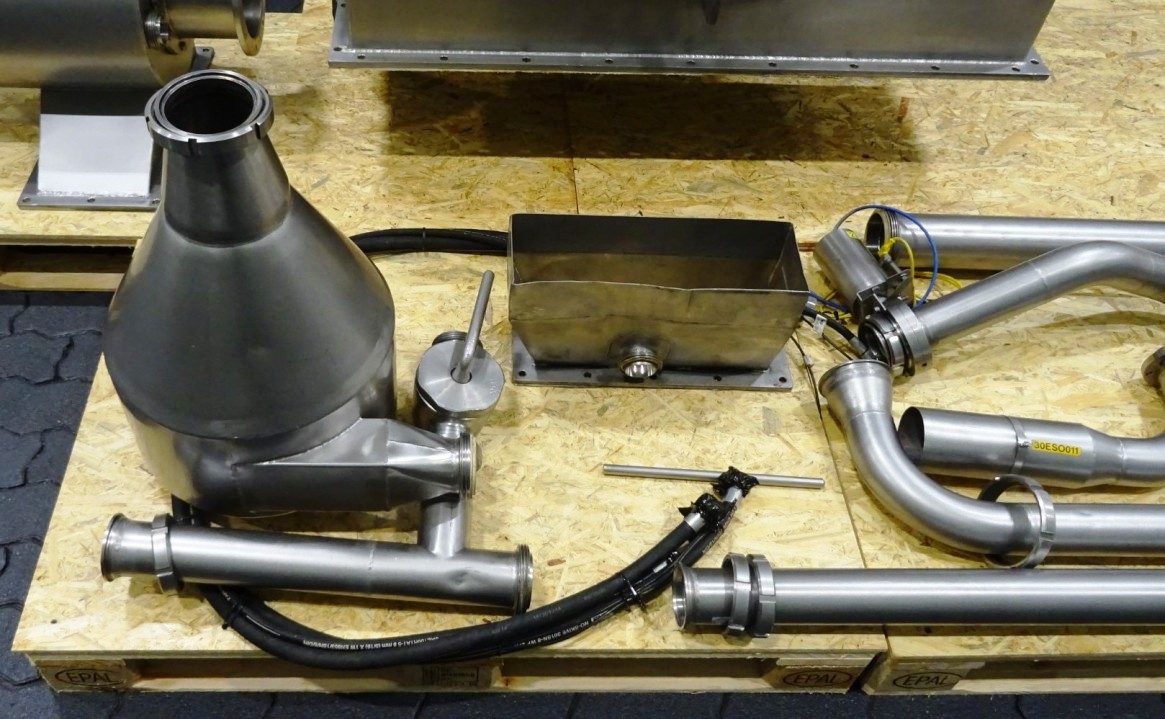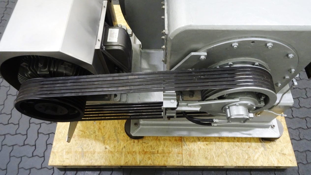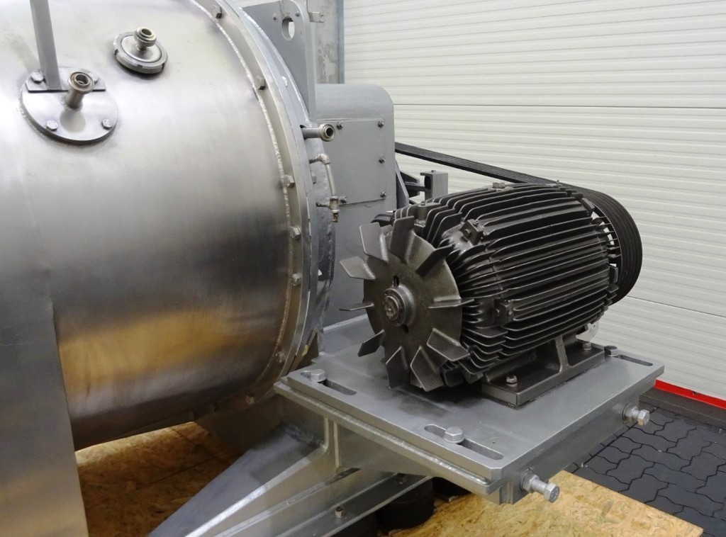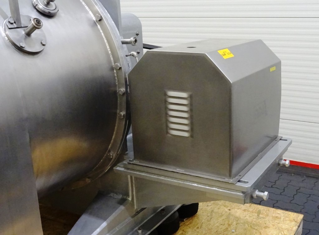 Max bowl speed 1500 RPM, rated @ 350 GPM, 40 TPH solids, 10 degree bowl, 8 flights, 2/3 turn, holes for washing, feed pipe, lube system, 45 KW motor 400/3/50/1475 RPM, 10:55 cyclo gearbox, guard, vibration isolators, chutes and piping. Prior use: Casein dewatering. 1990 vintage. Excellent condition. Located in Europe.
