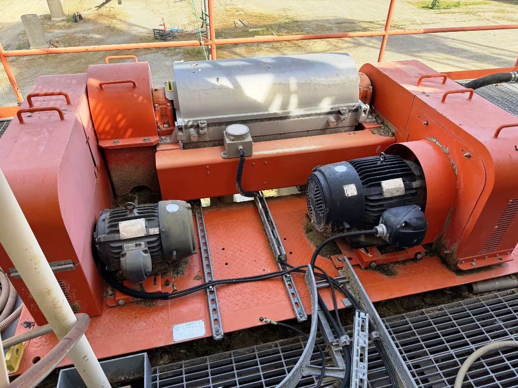 Max bowl speed 3300 RPM, 2150 G's, 14" x 34" bowl ID. 5" single lead STC-tiled conveyor, 25 HP XP motor 230/460/3/60/1775 RPM, gearbox, 7.5 HP XP backdrive, guards, feed tube and vibration isolators, mounted on an oilfield skid. No controls. 2014 vintage. Excellent condition.