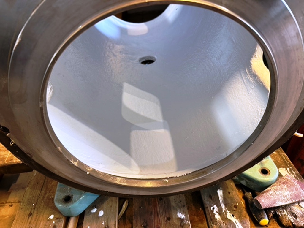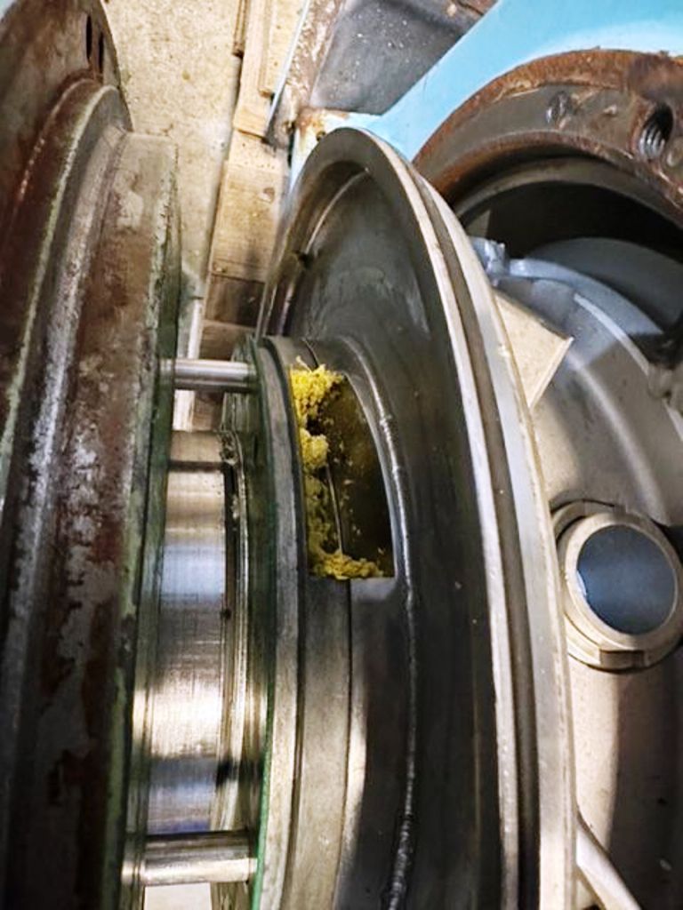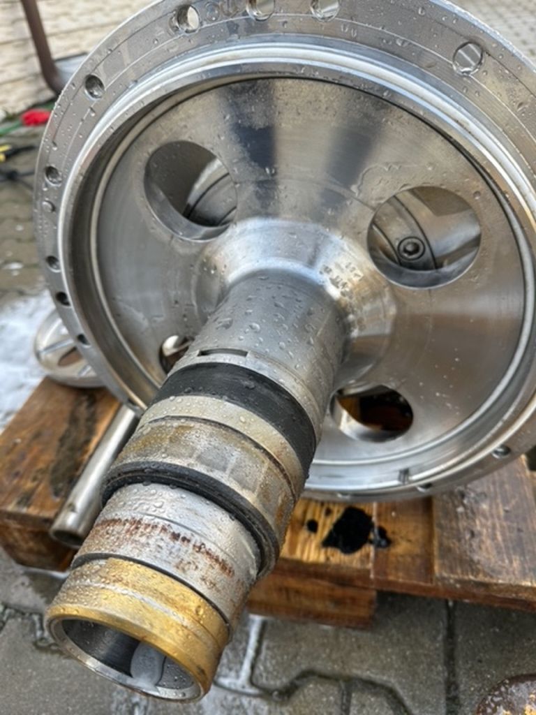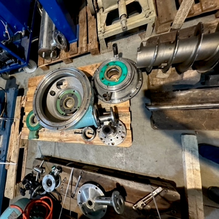 Max bowl speed 4000 RPM, 3180 x G, 8 degree beach angle, effluent discharged under pressure, 110mm single lead hardsurfaced conveyor, 30 KW XP motor 600/3/50/2980 RPM, Viscotherm ATEX hydraulic backdrive system, lube system, guards, feed tube, vibration isolators/switch and chutes, mounted on a stand with control panel. 1989 vintage. Reconditioned. Located in Europe.