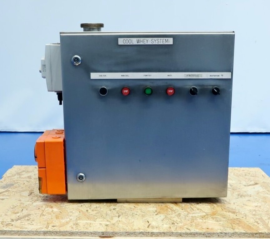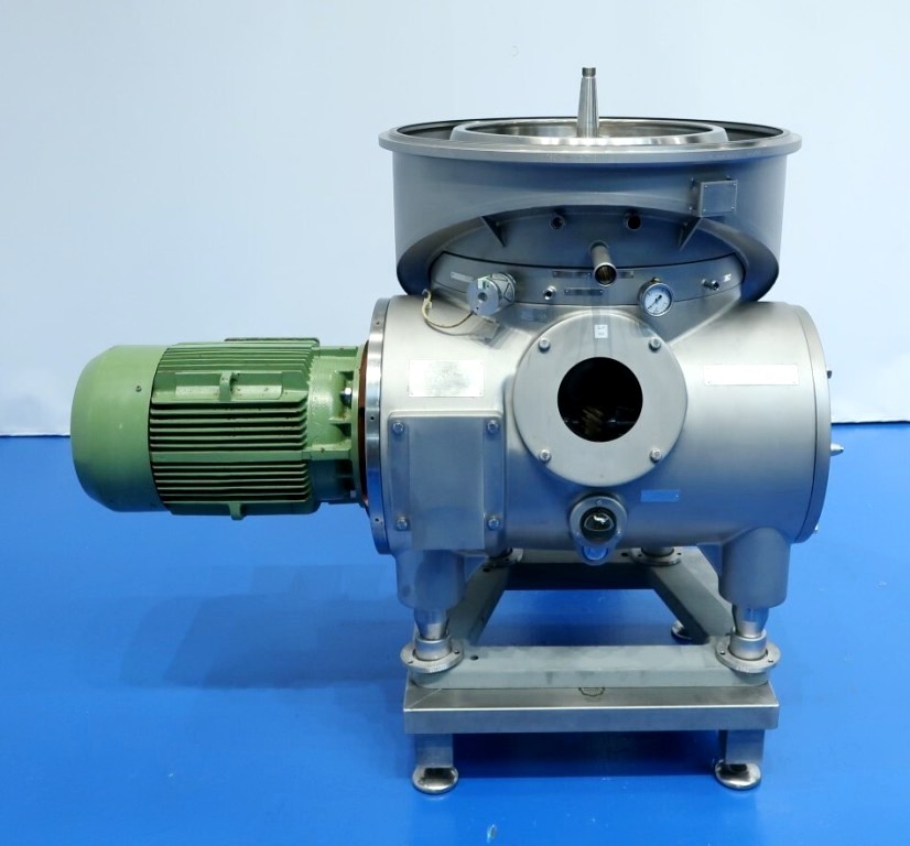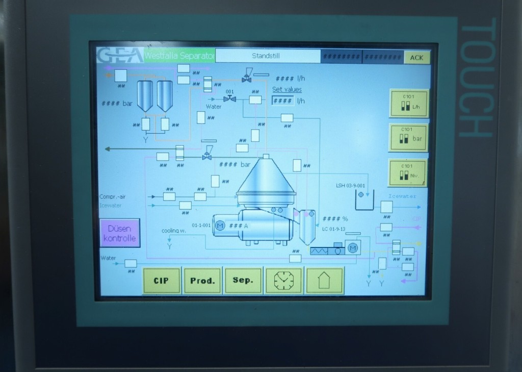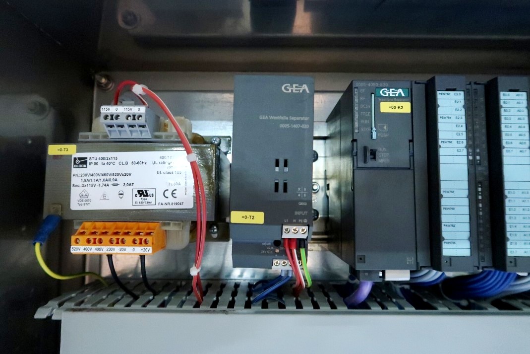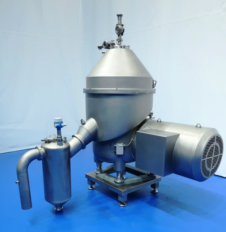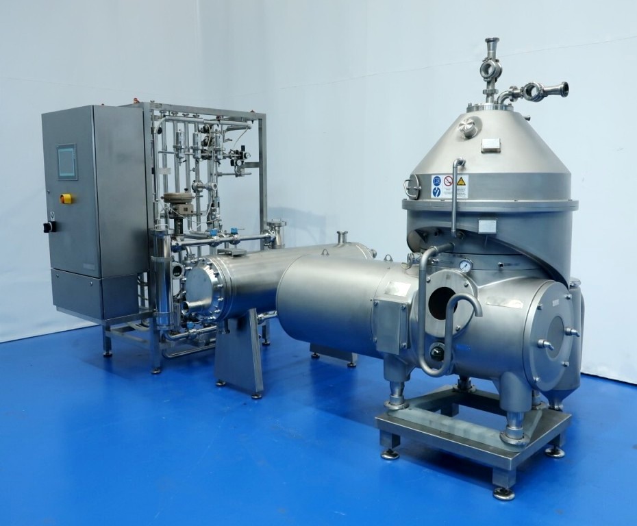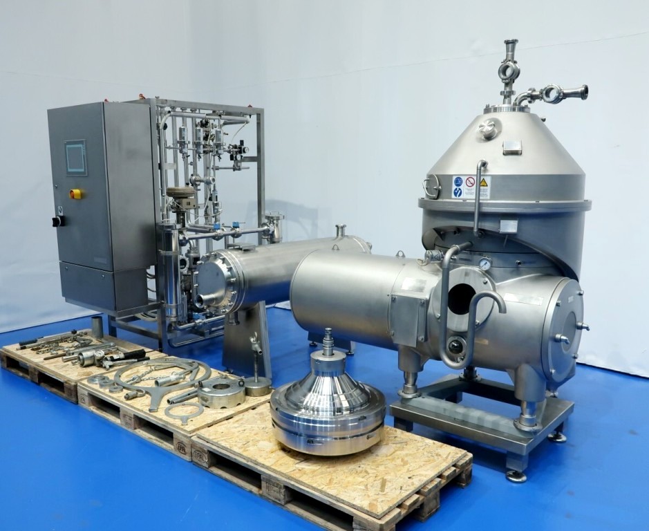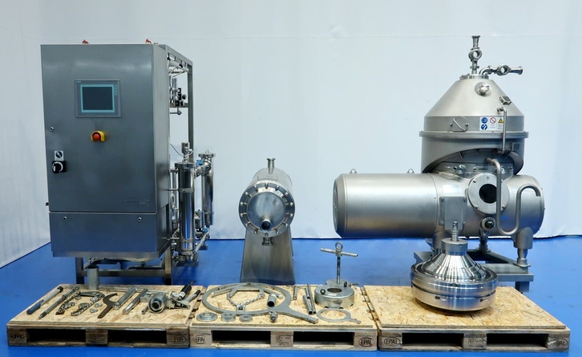Max bowl speed 6000 RPM, rated @ 4000-5400 LPH input, 900-1100 KPH output @ 18%. 22 KW motor 400/690/3/50/1480 RPM, solids cyclone, flow meter, filters, valves, sensors, base frame, vibration isolators, spare parts kit, tools and full documentation. CIP system, Westfalia C1000 cooler with 18.5 KW motor and sterile air filter, motor starter, PLC control panel with VFDs and touch screen HMI. 2010 vintage. Excellent condition. Located in Europe.