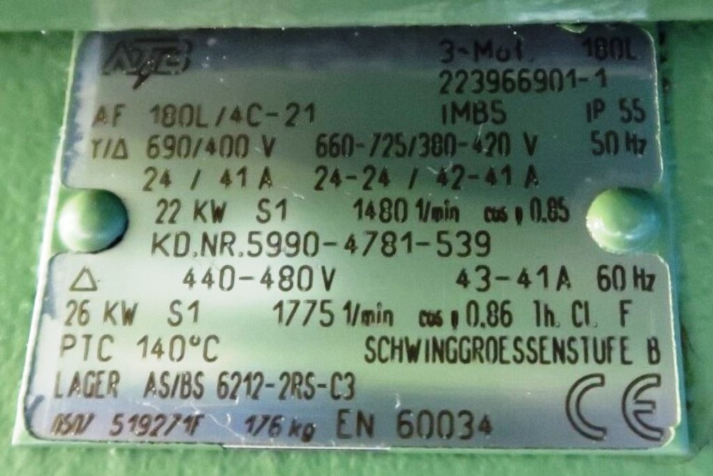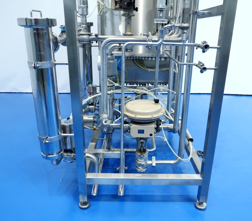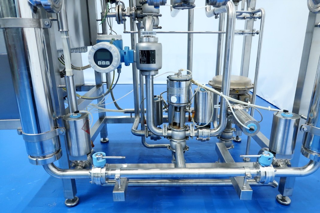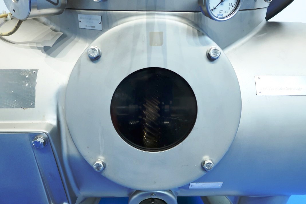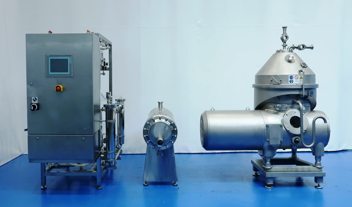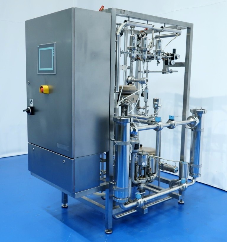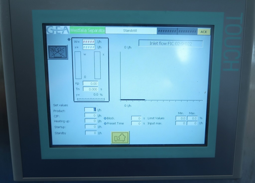 Max bowl speed 6000 RPM, rated @ 4000-5400 LPH input, 900-1100 KPH output @ 18%. 22 KW motor 400/690/3/50/1480 RPM, solids cyclone, flow meter, filters, valves, sensors, base frame, vibration isolators, spare parts kit, tools and full documentation. CIP system, Westfalia C1000 cooler with 18.5 KW motor and sterile air filter, motor starter, PLC control panel with VFDs and touch screen HMI. 2010 vintage. Excellent condition. Located in Europe.