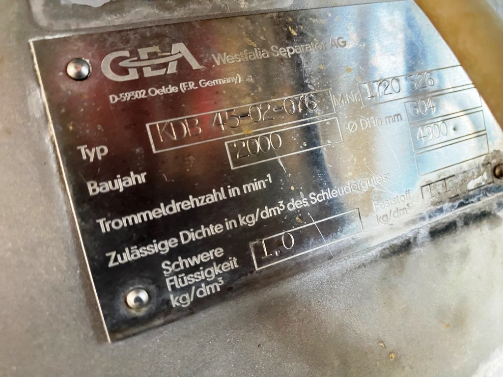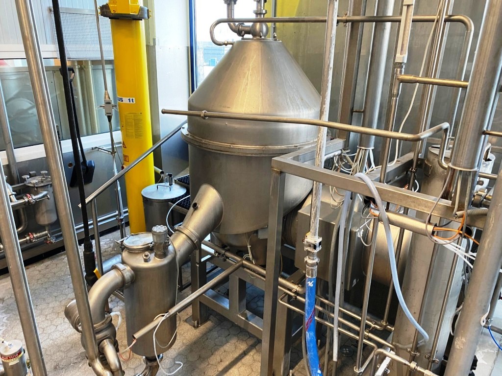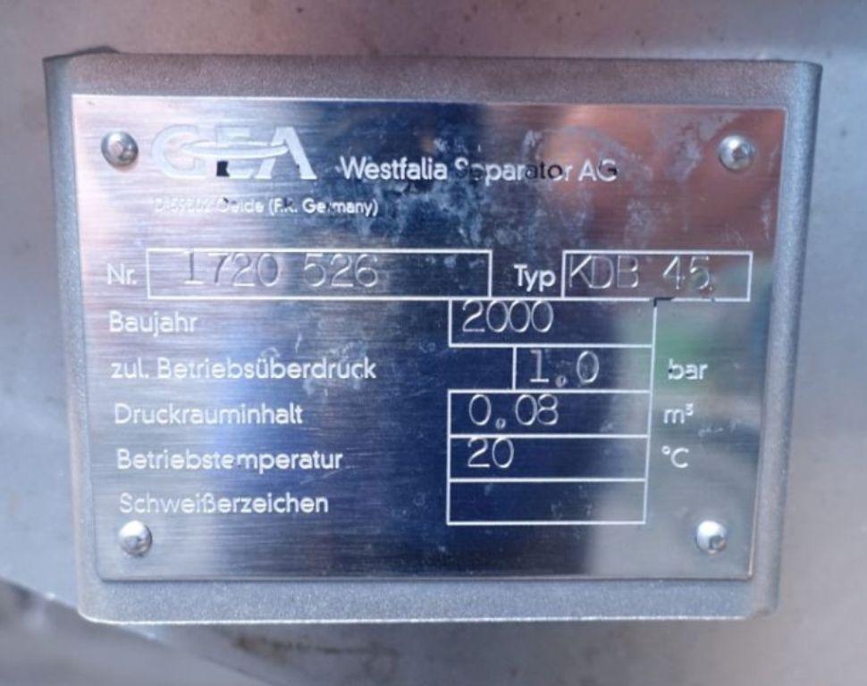 The Westfalia KDB 45-02-076 quark separator, complete plant, is engineered for high efficiency in dairy processing, particularly for the production of fresh and cream cheese. With a maximum bowl speed of 4900 RPM, this separator is capable of handling a substantial throughput, rated at 6600 liters per hour for fresh cheese and 3300 liters per hour for cream cheese. The robust 45 KW motor operates at 380/3/50/1470 RPM, ensuring reliable performance and consistent quality in the separation process. This complete plant is designed to integrate seamlessly into existing dairy operations, providing a comprehensive solution for quark production with minimal downtime and maximum output.