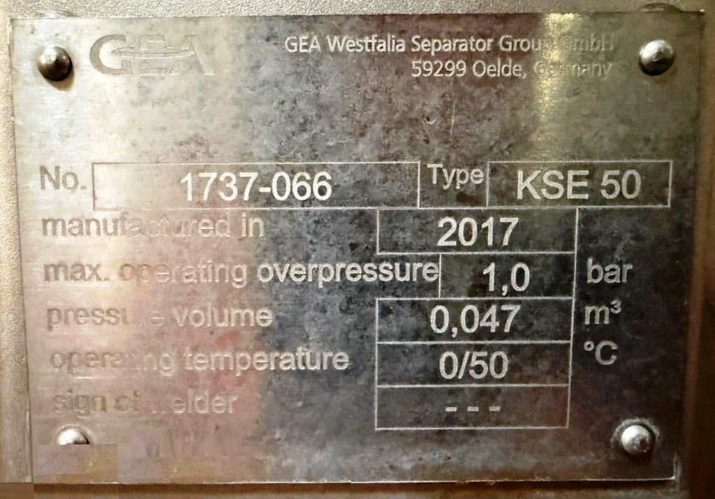 In addition to its impressive mechanical specifications, the Westfalia KSE 50-01-777 cream cheese separator features a state-of-the-art PLC control panel equipped with an Allen-Bradley PanelView Plus 1000 touch screen HMI. This advanced control system provides operators with an intuitive interface for monitoring and adjusting the separator's performance in real-time. The integration of a Fristam FPX 3541 centrifugal pump ensures reliable and efficient transfer of product, while the comprehensive set of interconnecting pipes and valves facilitates seamless operation. Although the unit is listed as being in very good condition, it is important to note that the motor is currently missing, which may require replacement or repair before full operational capability can be restored. This separator, manufactured in 2017, represents a valuable investment for businesses looking to enhance their cream cheese production capabilities with reliable and efficient equipment.