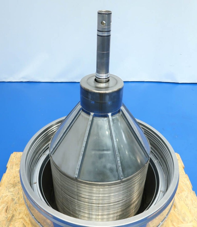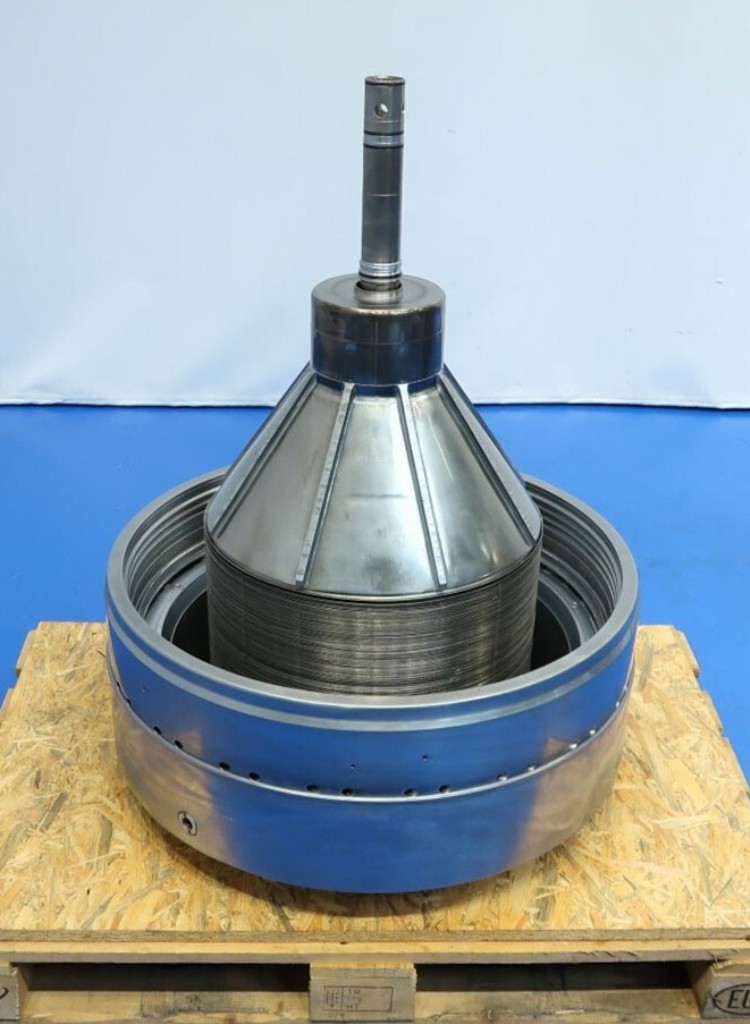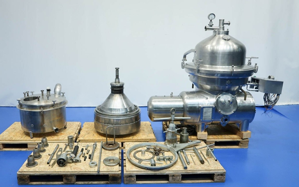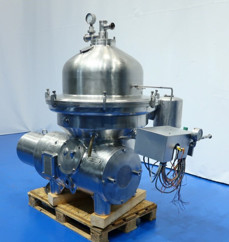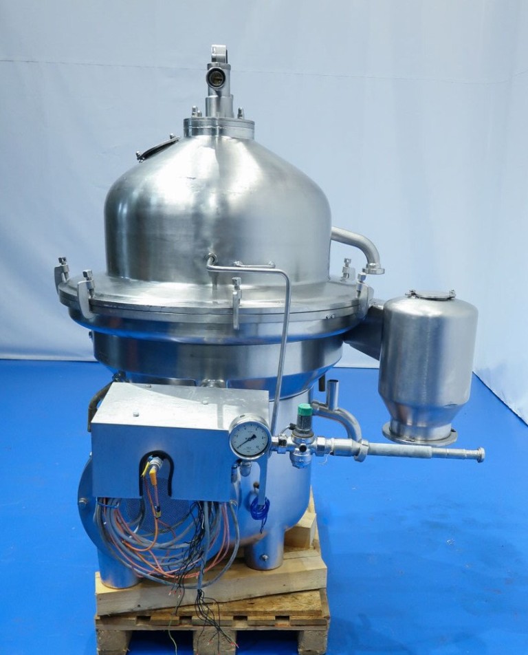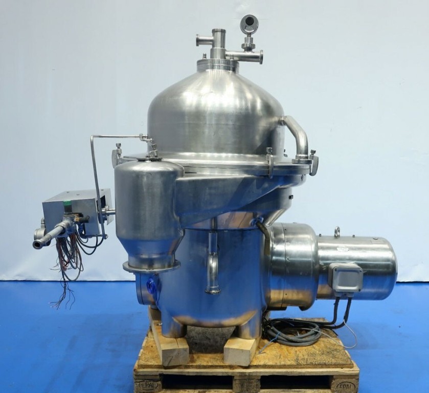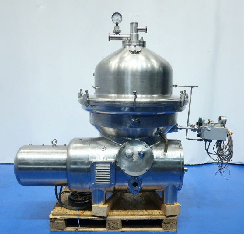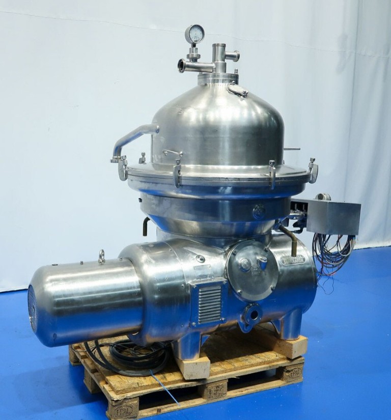 Max bowl speed 4700 RPM, rated @ 20,000 LPH skimming. 30 KW motor 380/3/50/1470 RPM, fluid clutch, sludge tank, 60 G (227 L) cream surge tank, counter pressure valve, cream flow regulator, pressure gauge and tools. 1970 vintage. Very good condition. Located in Europe.