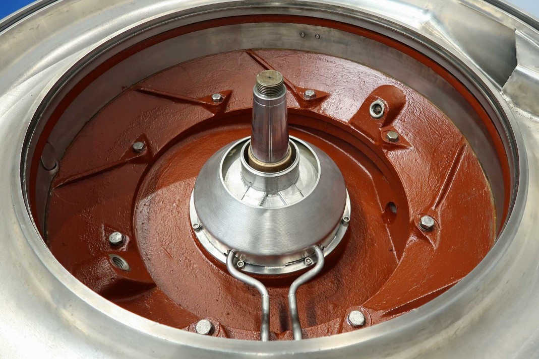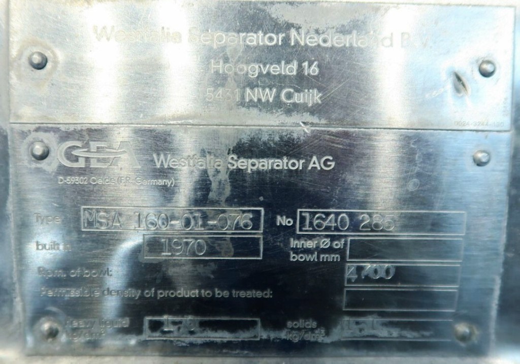 The Westfalia MSA 160-01-076 warm milk separator, 316SS. is engineered for optimal performance in the dairy processing industry, particularly in the separation of cream from milk. With a maximum bowl speed of 4700 RPM, this separator efficiently skims up to 20,000 liters per hour, making it an ideal choice for medium to large-scale operations. The robust 30 KW motor, rated at 380/3/50/1470 RPM, ensures reliable and consistent operation, while the fluid clutch allows for smooth engagement and disengagement, minimizing wear and tear on the machine components. This vintage unit, dating back to 1970, has been well-maintained and is in very good condition, demonstrating the durability and longevity that Westfalia equipment is known for in the industry.