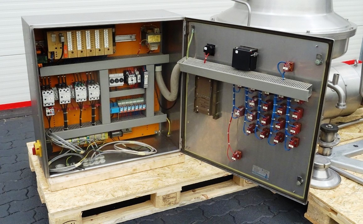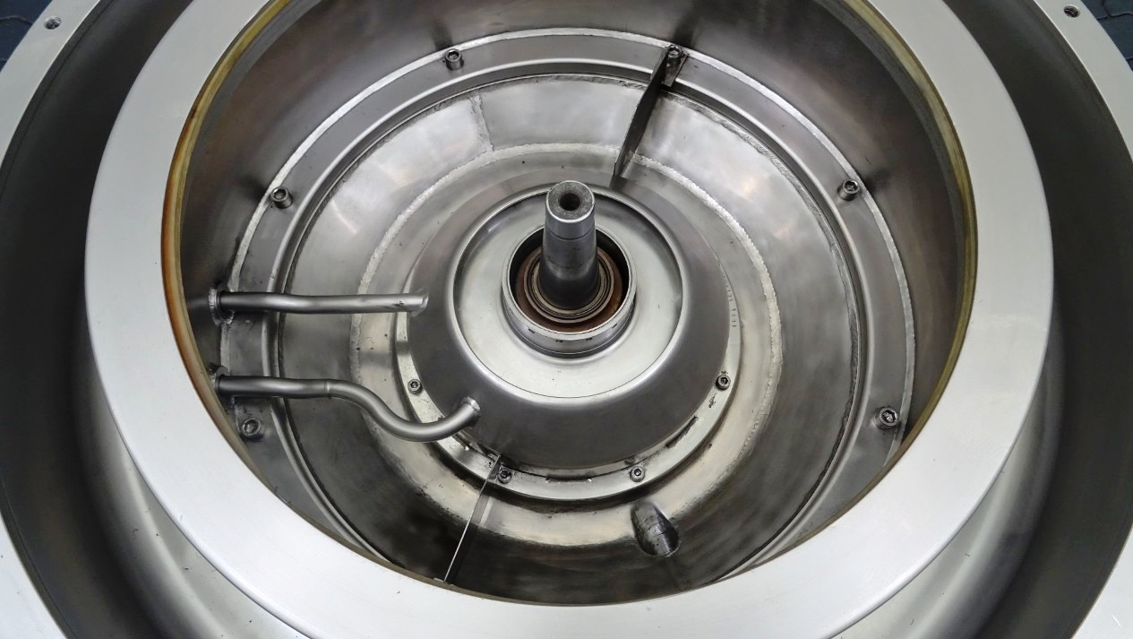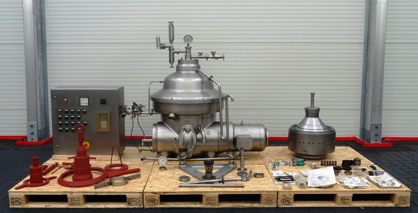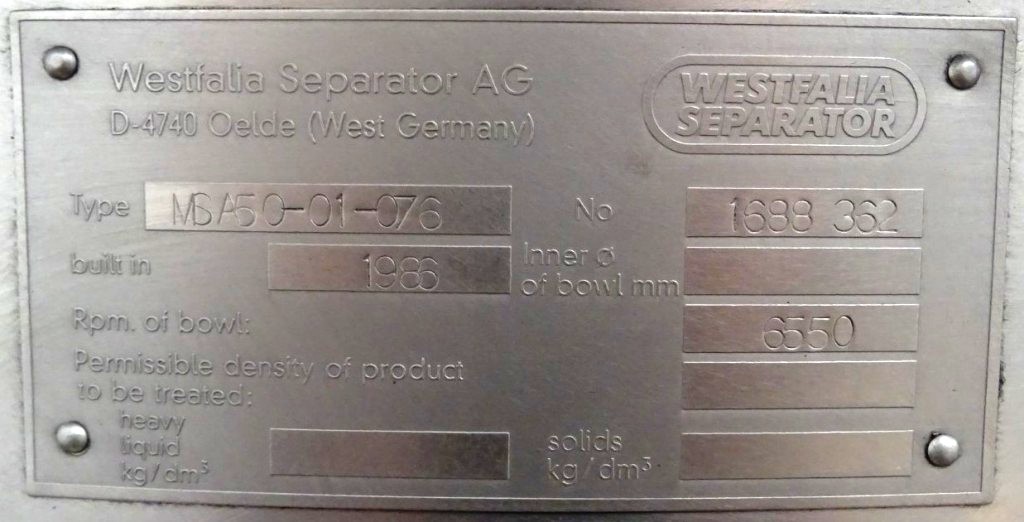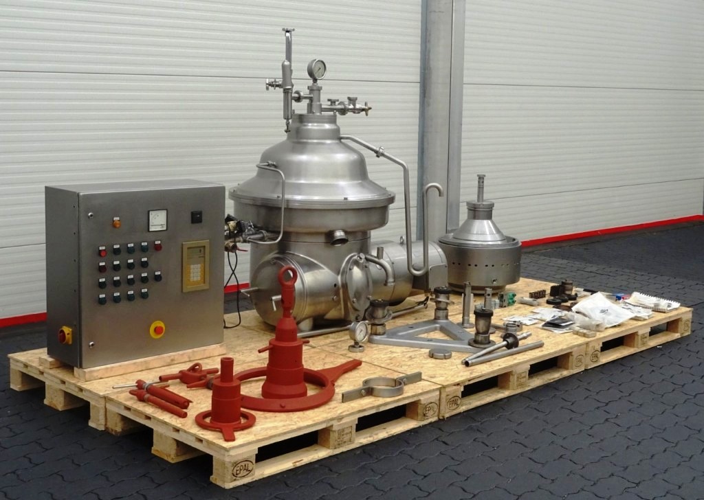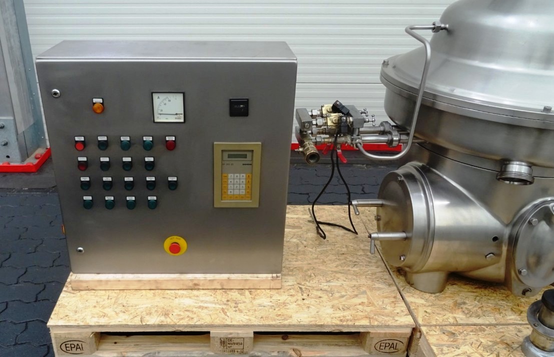 Max bowl speed 6550 RPM, rated @ 5000 LPH milk or whey. 15 KW motor 380/3/50/1450 RPM, base frame, water valves, inlet/outlet pipes with flow indicator, tools and control panel. 1986 vintage. Very good condition. Located in Europe.