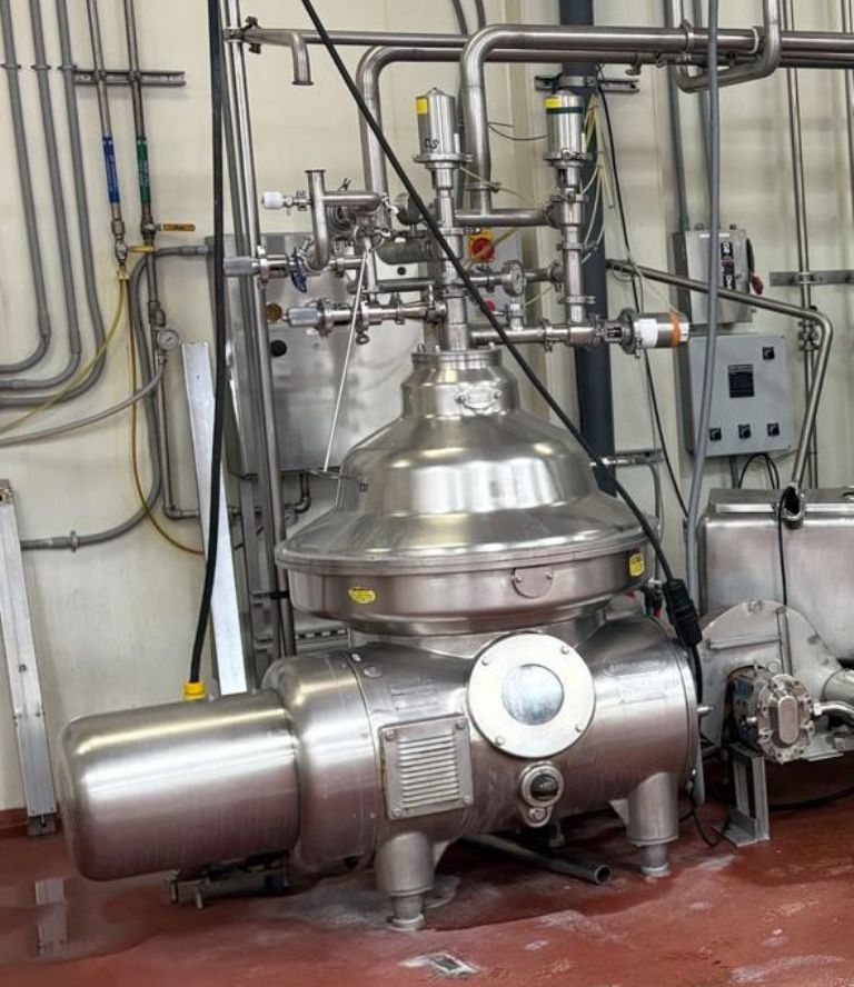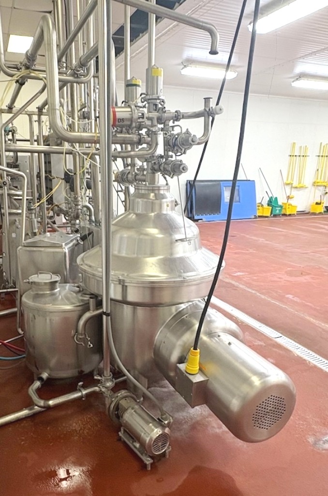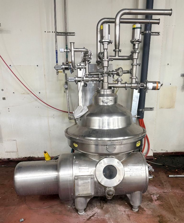 The Westfalia MSA 90-01-076 milk separator, 316SS. is engineered for high efficiency and reliability in the dairy processing industry. With a maximum bowl speed of 5920 RPM, this separator is capable of handling up to 10,000 liters per hour of hot milk, making it an ideal choice for large-scale operations. The robust 30 HP motor, operating at 460 volts, 3-phase, and 60 Hz, ensures consistent performance while maintaining energy efficiency. The pneumatic milk counter pressure valve allows for precise control over the separation process, enhancing product quality and consistency. Additionally, the integrated flow indicator provides real-time monitoring of the milk flow, ensuring optimal operational efficiency and minimizing downtime during production runs.