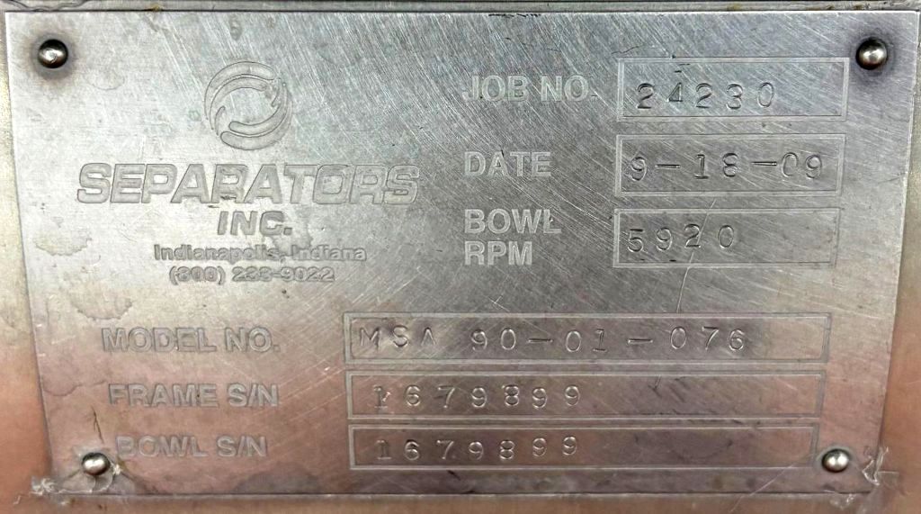 Max bowl speed 5920 RPM, rated @ 10,000 LPH on hot milk. 30 HP motor 460/3/60/1750 RPM, pneumatic milk counter pressure valve , flow indicator, manual cream flow regulation valve and all inlet/outlet piping. No tools or control panel. 1982 vintage. Very good condition.