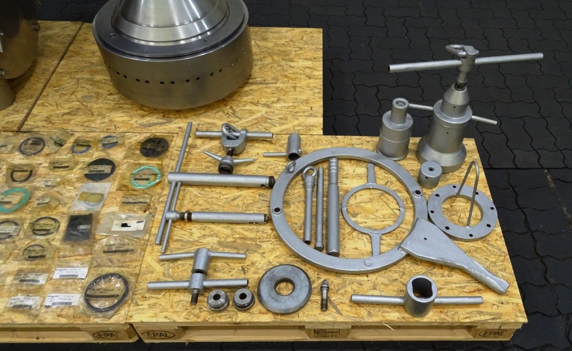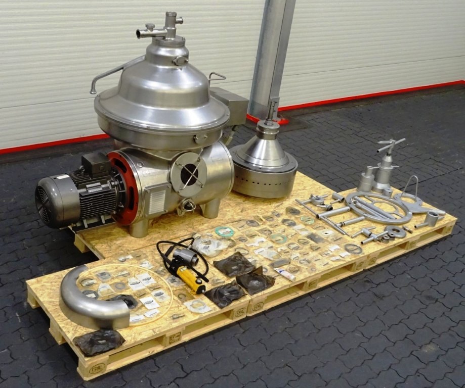 Max bowl speed 5920 RPM, rated @ 10,000 LPH on hot milk. 18.5 KW motor 230/460/3/50/1770 RPM, water valves, all inlet/outlet pipes, tools and several spare parts. 1982 vintage. Very good condition. Located in Europe.