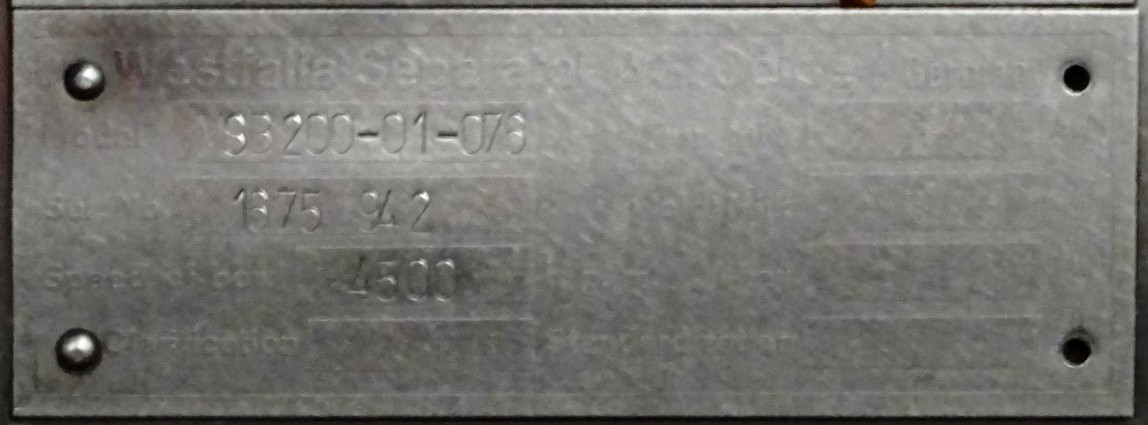 The Westfalia MSB 200-01-076 milk separator, 316SS. is engineered for high-efficiency milk processing, making it an invaluable asset for dairy operations looking to optimize their production capabilities. With a maximum bowl speed of 4500 RPM, this separator is capable of handling a rated separation capacity of 25,000 liters per hour (LPH). This impressive throughput is complemented by a robust 37 KW motor operating at 460 volts, 3-phase, 60 Hz, and 1775 RPM, ensuring reliable and consistent performance even during peak operational demands. The inclusion of a counter pressure valve on the inlet allows for precise control over the flow of milk entering the separator, while the integrated manometer provides real-time pressure readings, enabling operators to monitor system performance effectively.
