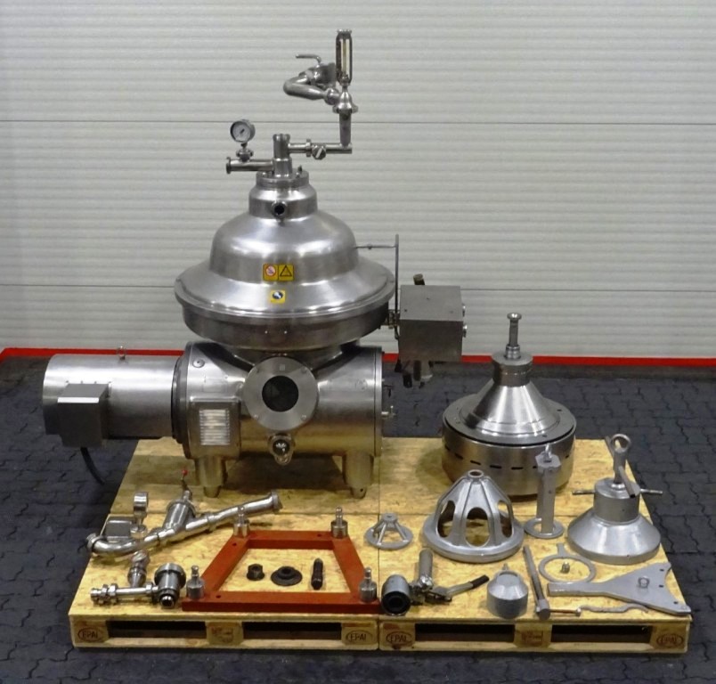 Max bowl speed 5920 RPM, rated @ 15,000 LPH for skimming, 22,500 LPH for milk cleaning or standardization, 30 KW motor 200/3/50/60, water valves, all inlet/outlet pipes with pumps, flow indicators, sample valves, base plate with feet, tools and manual. 1996 vintage. Very good condition. Located in Europe.