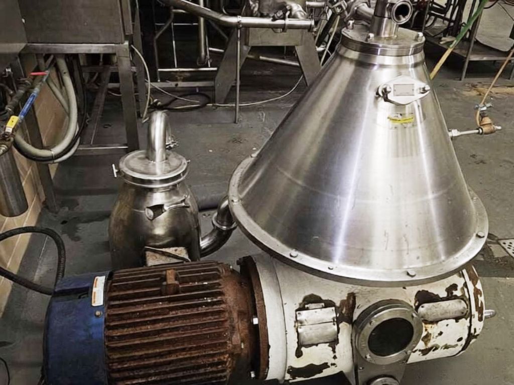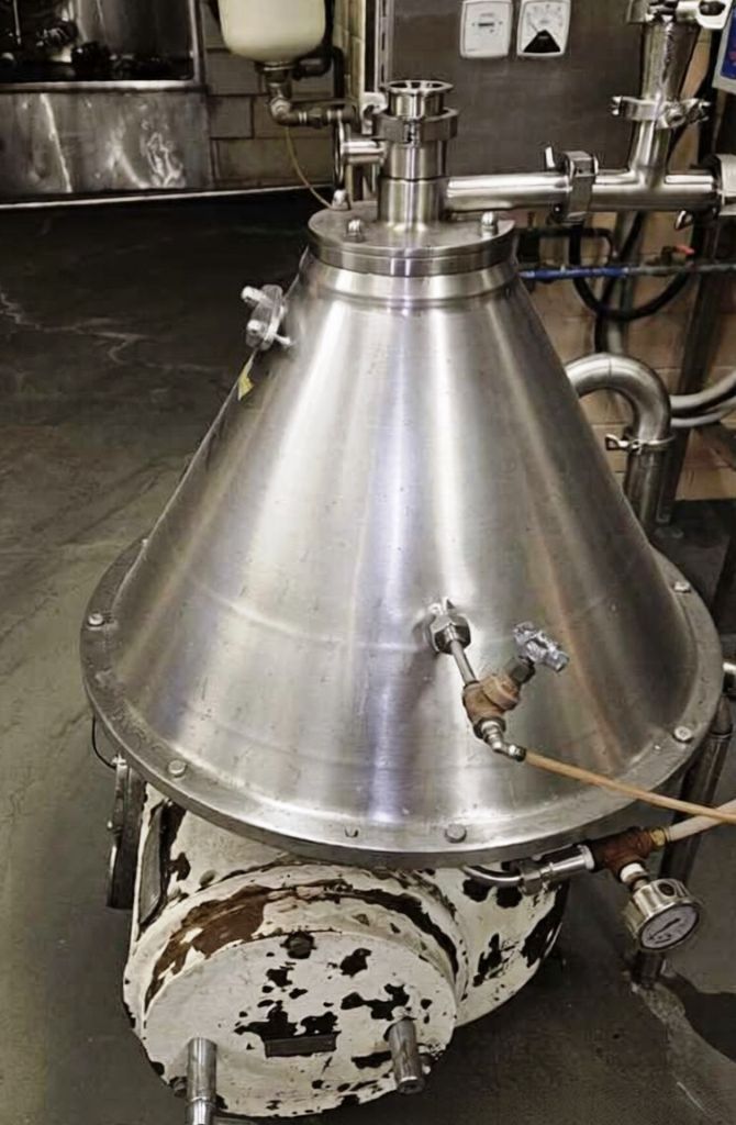 The Westfalia MSD 60-01-076 milk separator, 316SS. is engineered for high efficiency and reliability in the dairy processing industry. With a bowl speed of 6500 RPM, this separator is capable of handling substantial volumes of milk, achieving a remarkable throughput of 10,500 liters per hour for milk standardization, cleaning, and whey skimming. For operations focused solely on milk skimming, the unit can efficiently process up to 7000 liters per hour. This impressive performance is powered by an 11 kW motor, designed to operate at 575 volts, 3-phase, and 60 Hz, ensuring optimal energy consumption while maintaining high output. The separator is equipped with inlet and outlet piping, as well as necessary tools and control panels, making it a comprehensive solution for your dairy processing needs.
