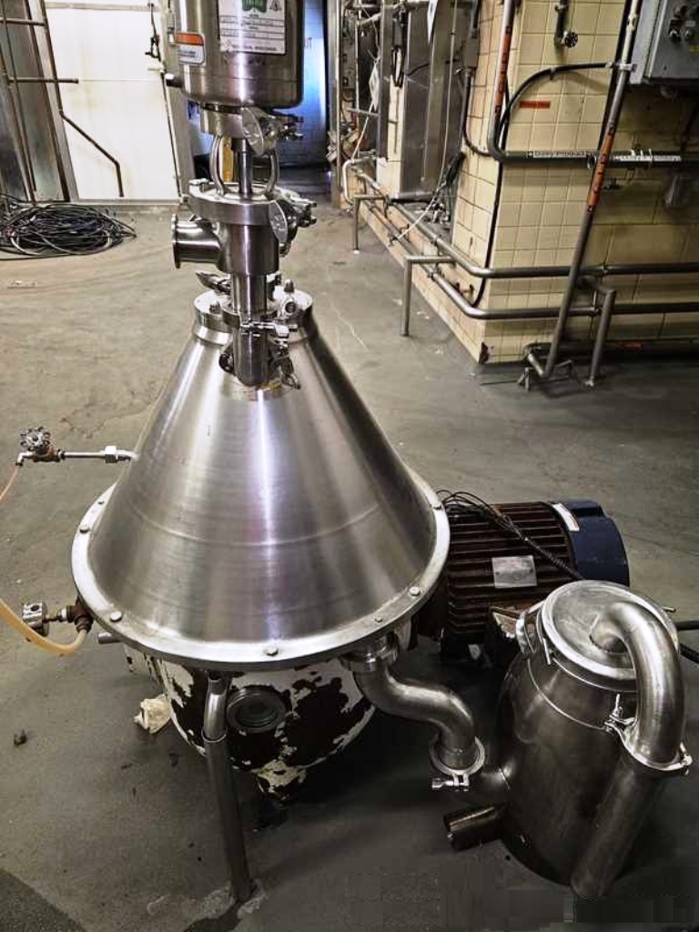 Bowl speed 6500 RPM, rated @ 10,500 LPH milk standardization/cleaning/whey skimming, 7000 LPH milk skimming, 11 KW motor 575/3/60/1770 RPM, inlet/outlet piping, tools and control panels. 1983 vintage. Very good condition. Located in Canada.