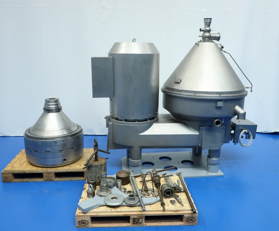 The Westfalia MSE 500-01-177 warm milk/whey skimmer, 316SS. is designed for high efficiency in the dairy processing industry, particularly for the separation of cream from milk and whey. With a maximum bowl speed of 4800 RPM, this skimmer is capable of handling a remarkable throughput of 113,500 PPH or 50,000 LPH, making it an ideal solution for medium to large-scale operations. The solids space of 21 liters allows for effective separation while maintaining optimal flow rates. The unit operates at a feed pressure of 6 bar, ensuring that the milk and cream are discharged under pressure via reliable centripetal pumps, which enhances the efficiency of the skimming process. The hydro-hermetically sealed feed and discharge systems minimize the risk of contamination, ensuring that the final product meets the highest quality standards.