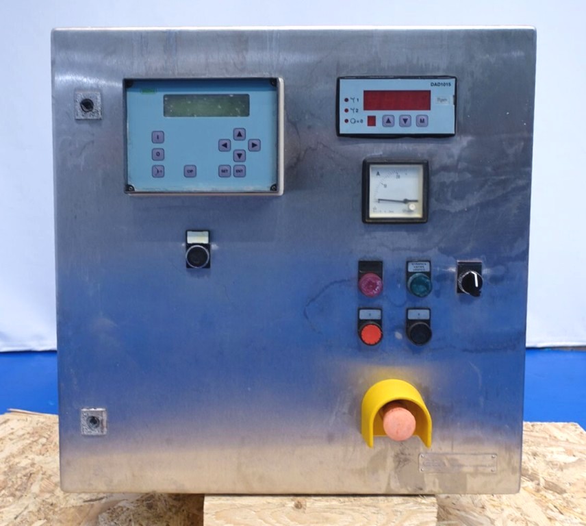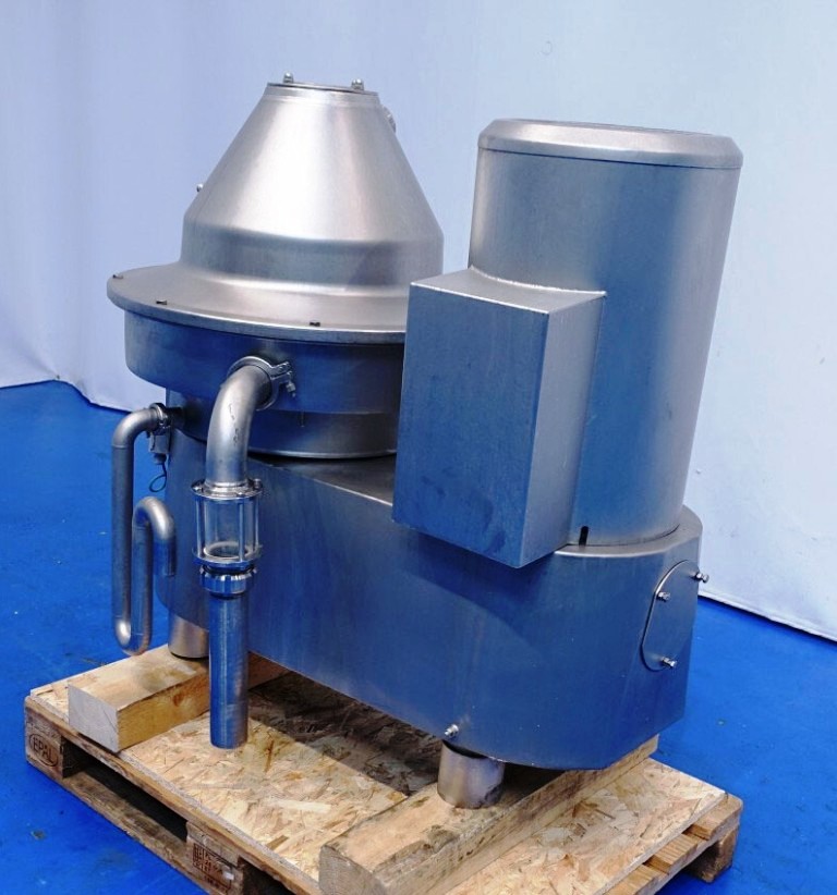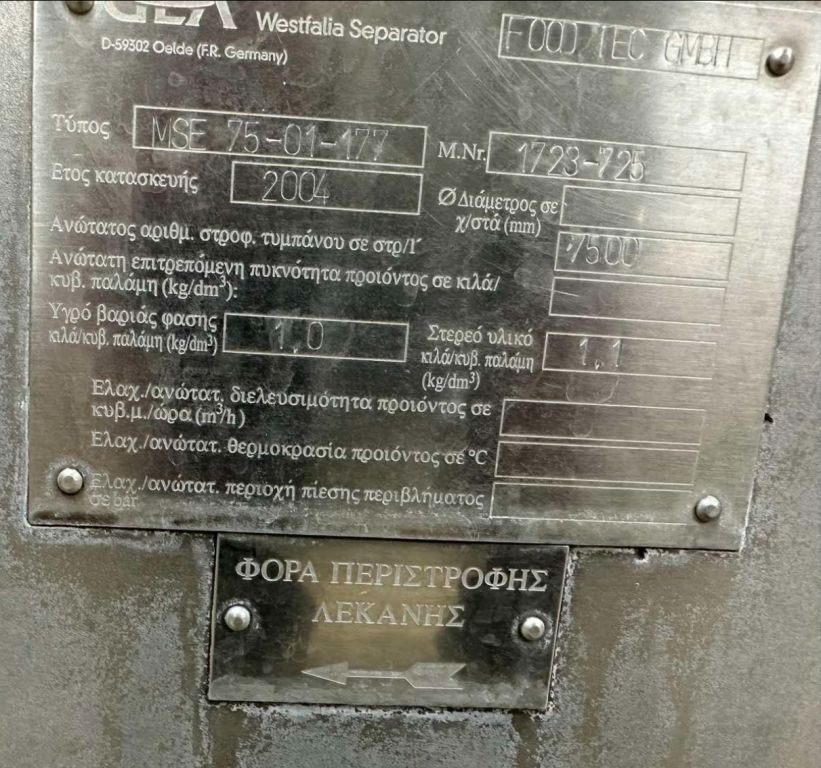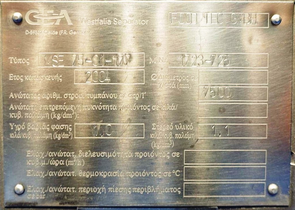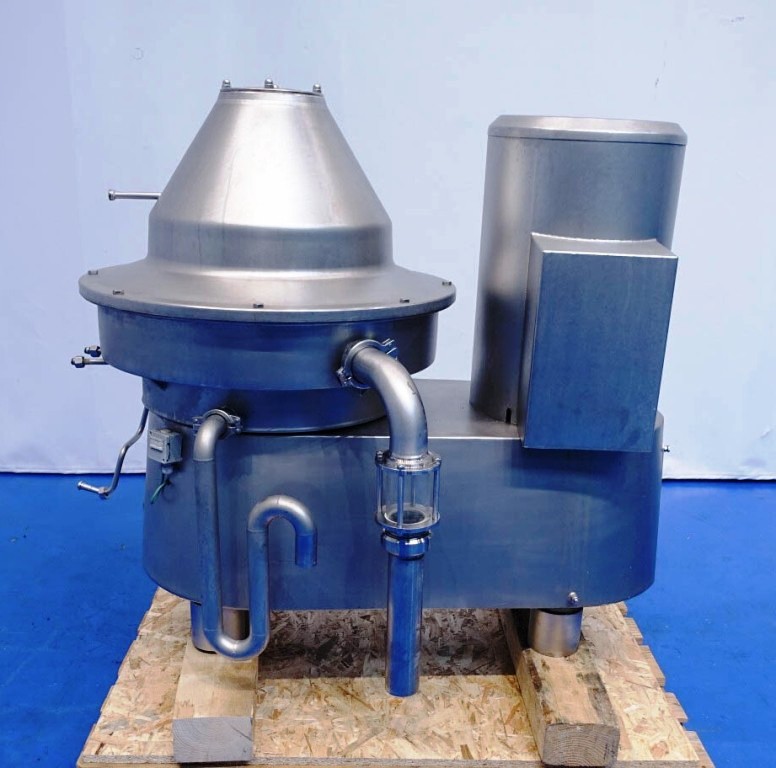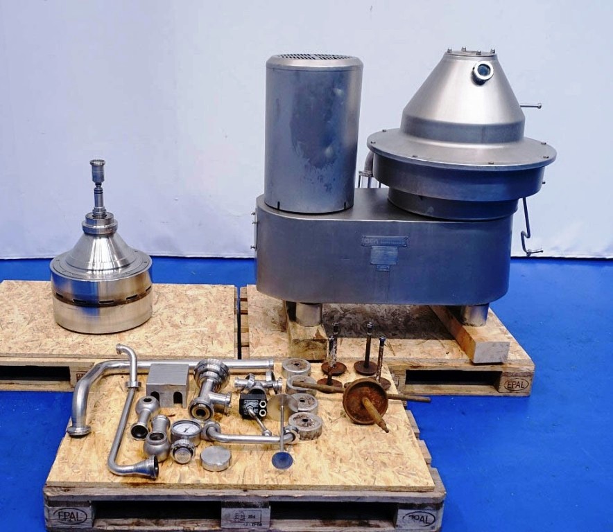 Max bowl speed 5500 RPM, rated @ 7500 LPH skimming, 10,500 LPH standardization, 1.5 bar, 3 L solids capacity. 15 KW motor 380/3/50/2940 RPM, tools and controls. 2004 vintage. Very good condition. Located in Europe.