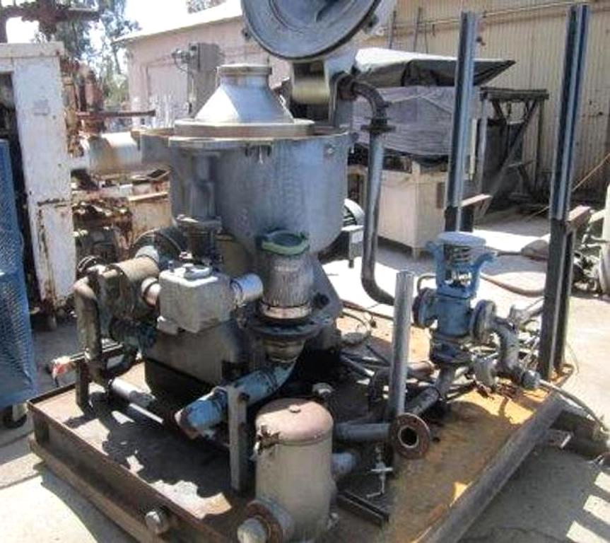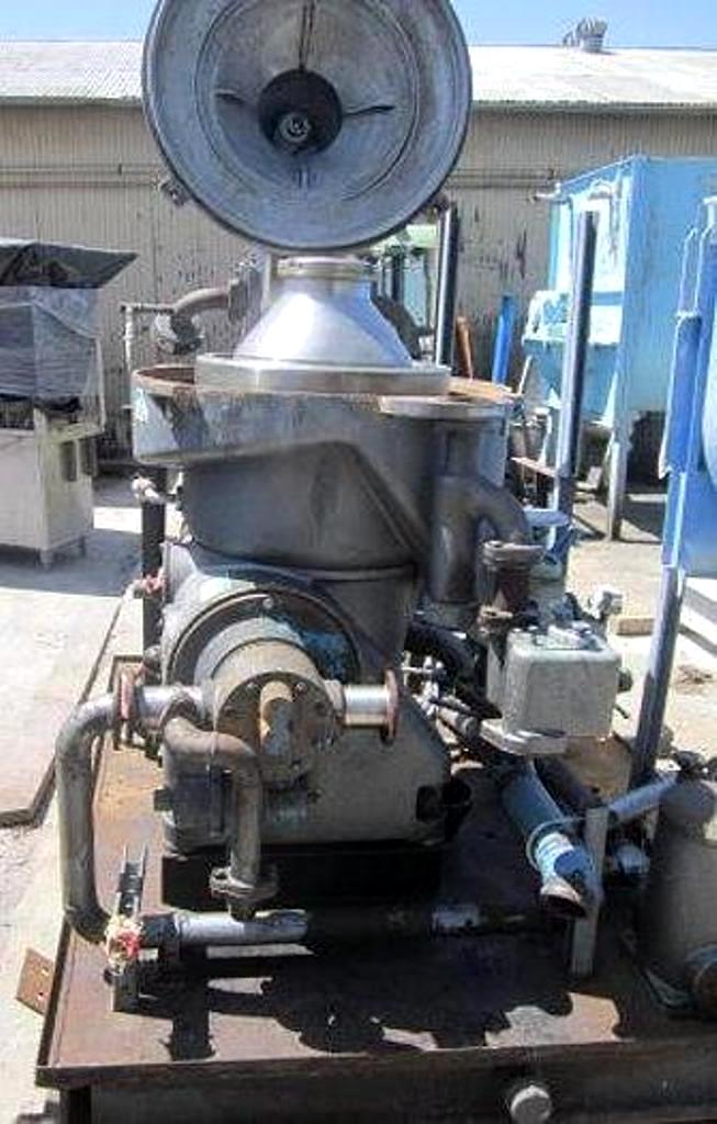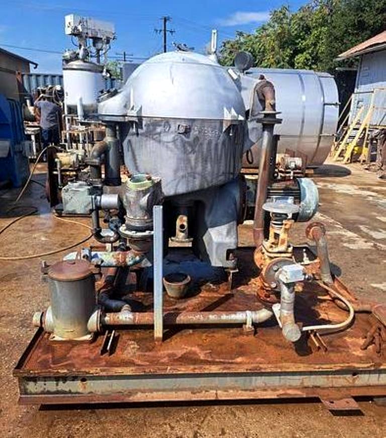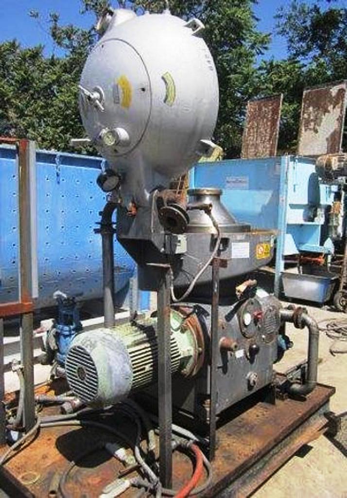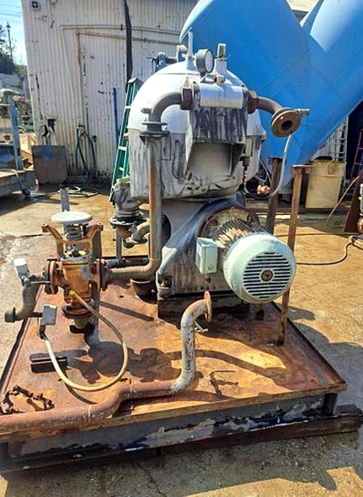 Max bowl speed 6600 RPM, rated @ 12,300 LPH, oil discharge under pressure, 15.7 KW XP motor 440/3/60/1755 RPM and feed pump on skid. No controls or tools. 1982 vintage. Very good condition.