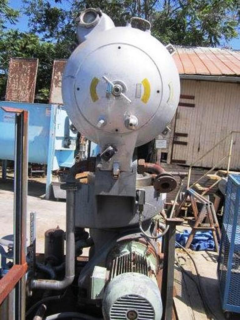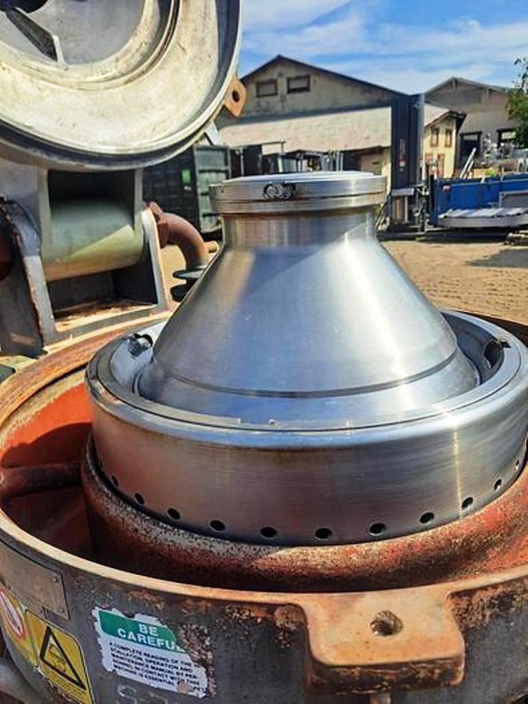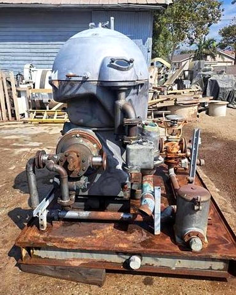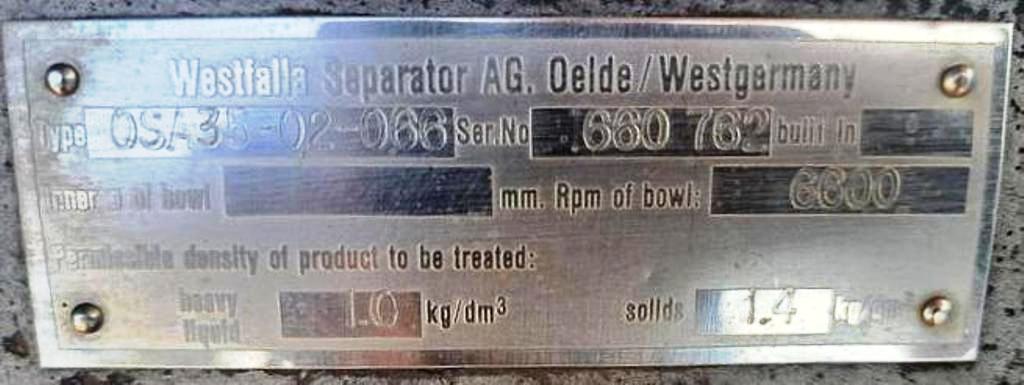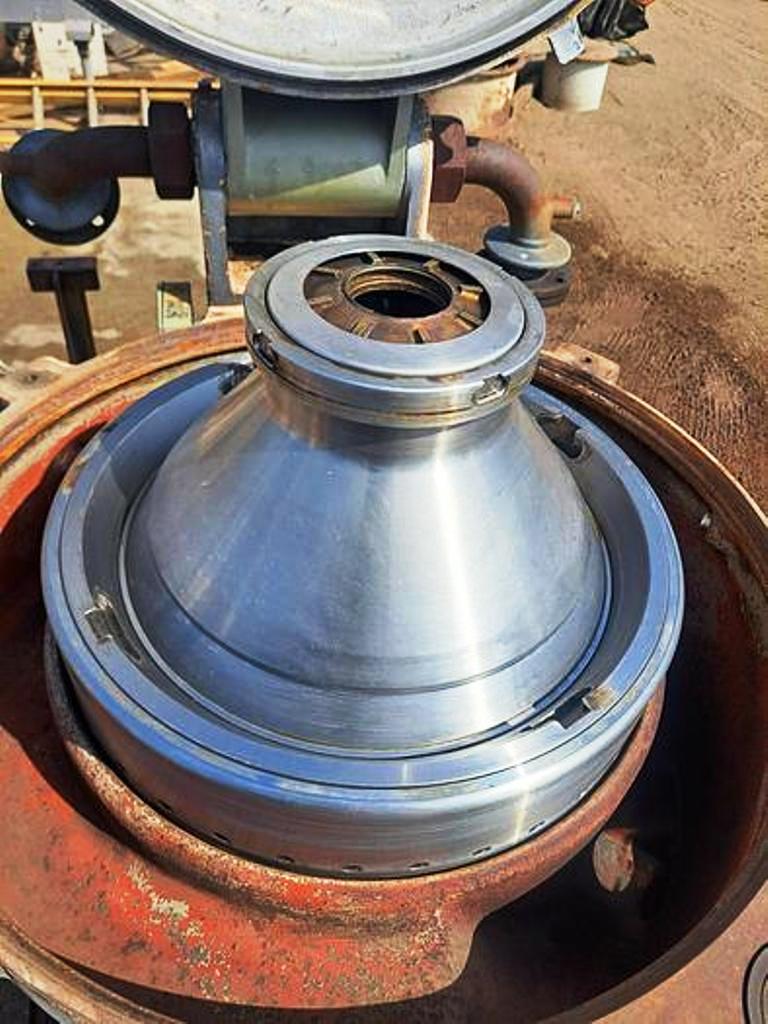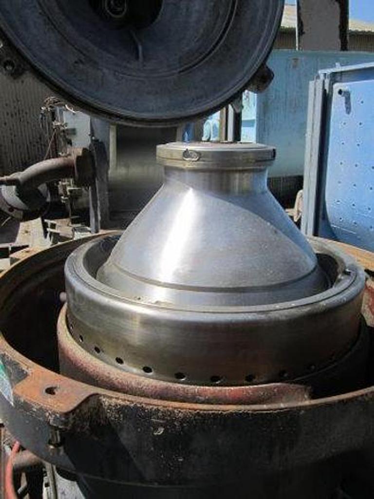 Max bowl speed 6600 RPM, rated @ 12,300 LPH, oil discharge under pressure, 15.7 KW XP motor 440/3/60/1755 RPM and feed pump on skid. No controls or tools. 1982 vintage. Very good condition.