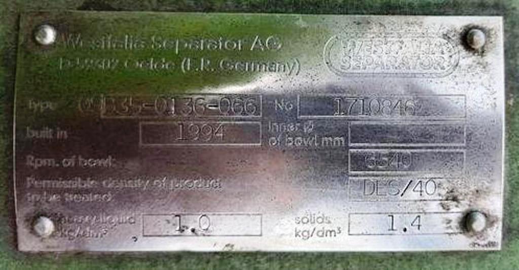 Max bowl speed 6540 RPM, 10,800 x G, rated @ 50 GPM, oil discharged under pressure, 20 HP motor 230/460/3/60/1755 RPM. 1994 vintage. Very good condition.