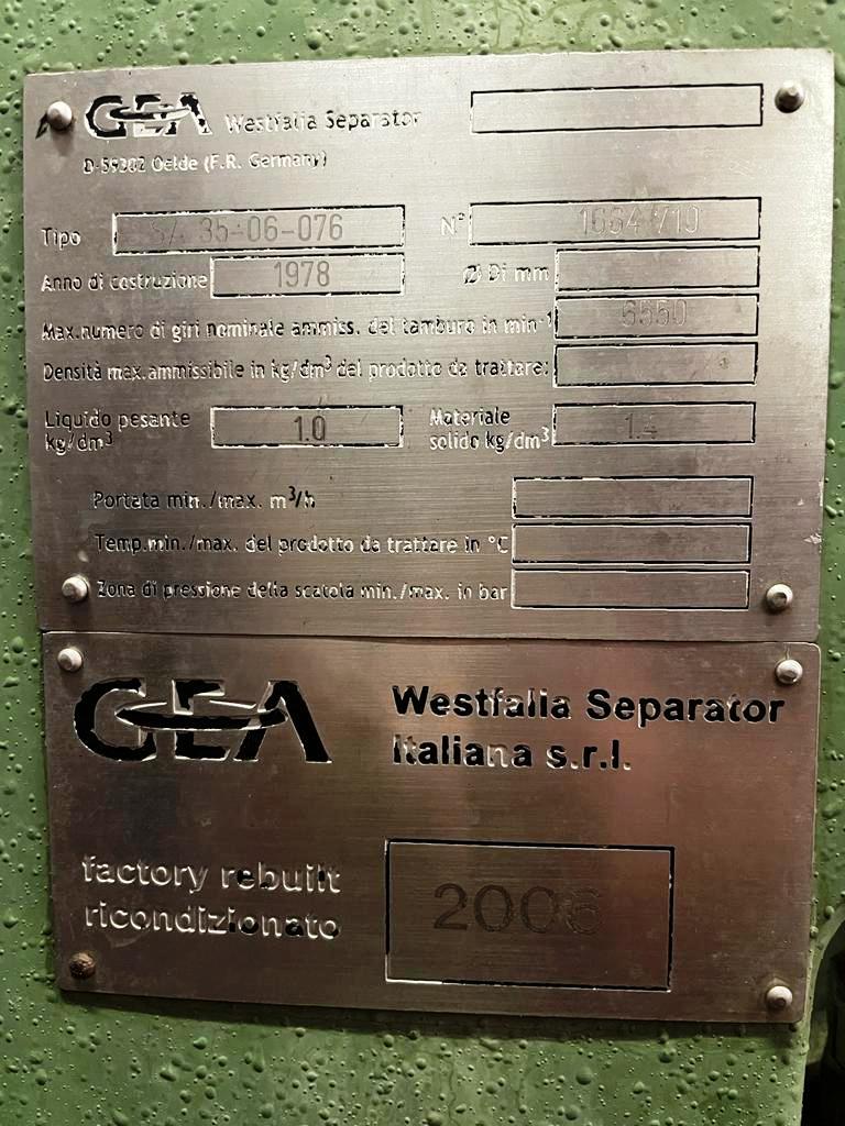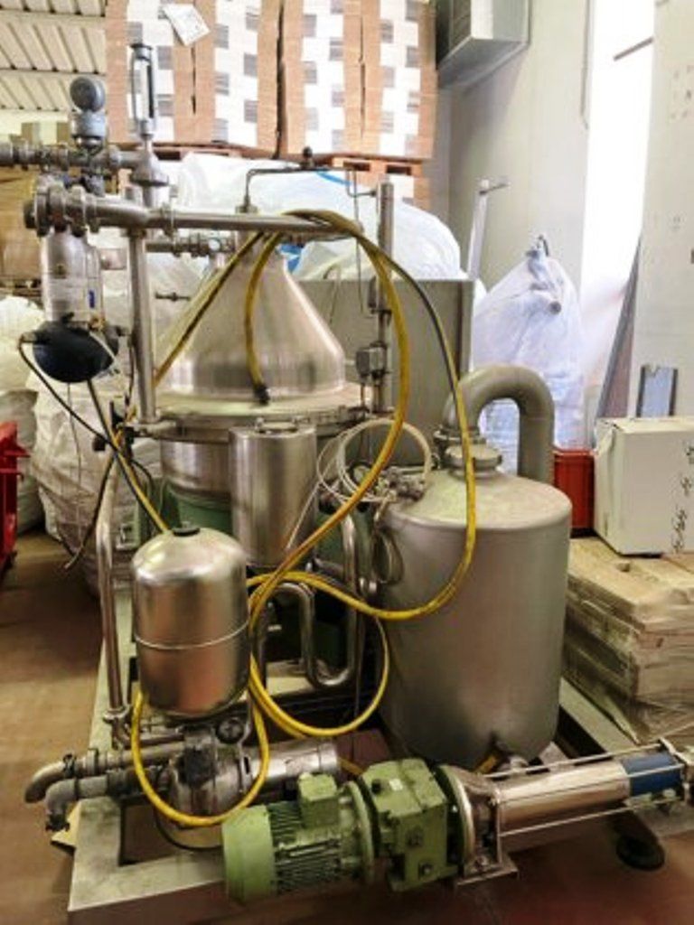 Max bowl speed 6500 RPM, rated @ 11,000 LPH. 18.5 KW motor 380/3/50/1450 RPM, manual valve NW 40, flow meter, manometer on outlet, solids cyclone, tank, feed pump, tools, manuals and PLC control panel, unitized on a skid. 1978 vintage; reconditioned by OEM in 2006. Excellent condition. Located in Europe.