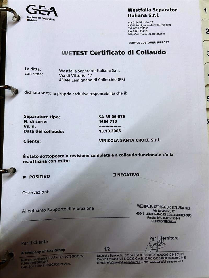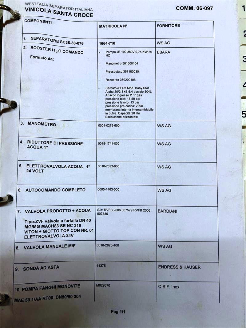 Constructed from high-grade 316 stainless steel, the Westfalia SA 35-06-076 is designed for durability and longevity, even in demanding industrial environments. The skid-mounted design facilitates easy installation and mobility, allowing for seamless integration into existing production lines. This centrifuge has been meticulously reconditioned by the original equipment manufacturer (OEM) in 2006, ensuring that it operates in excellent condition and meets modern performance standards. The package includes essential components such as a tank, feed pump, tools, manuals, and a PLC control panel, providing a comprehensive solution for wine clarification. With its impressive specifications and reliable performance, this centrifuge is an invaluable asset for any winery aiming to optimize their clarification processes and improve product quality.