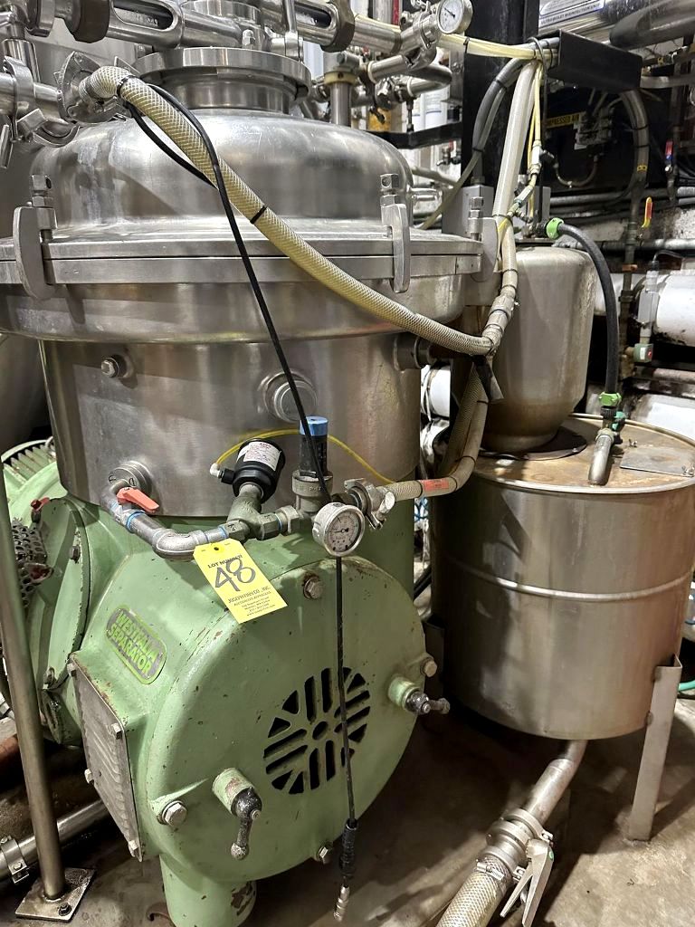 The Westfalia SA 40-47-076 hermetic clarifier centrifuge, 316SS is engineered for high-efficiency separation processes, making it an essential component in various industrial applications. With a maximum bowl speed of 4650 RPM, this centrifuge is capable of processing up to 18,000 liters per hour, allowing for significant throughput in demanding environments. The 16-liter solids volume capacity ensures that it can handle substantial amounts of sludge, making it ideal for industries such as food and beverage, pharmaceuticals, and wastewater treatment. The robust 30 HP motor, which operates at 230/460 volts and 60 Hz, provides reliable power and performance, ensuring that the centrifuge can maintain its operational efficiency even under heavy loads.