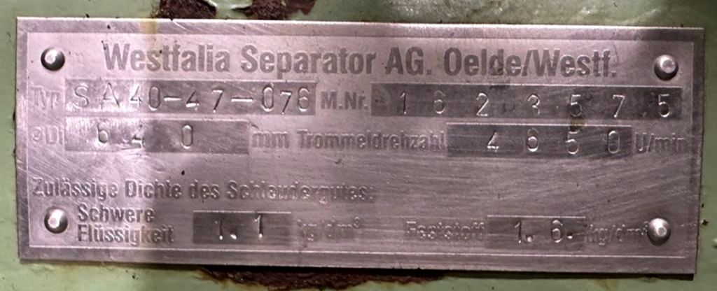Incorporating advanced technology and engineering, the Westfalia SA 40-47-076 hermetic clarifier centrifuge is not only efficient but also user-friendly. The control panel allows for straightforward operation, enabling operators to monitor and adjust settings with ease. This centrifuge is an excellent investment for businesses looking to enhance their separation processes, improve product quality, and reduce operational costs. With its combination of high performance, durable construction, and ease of use, the Westfalia SA 40-47-076 is a reliable choice for any industrial application requiring effective solid-liquid separation.