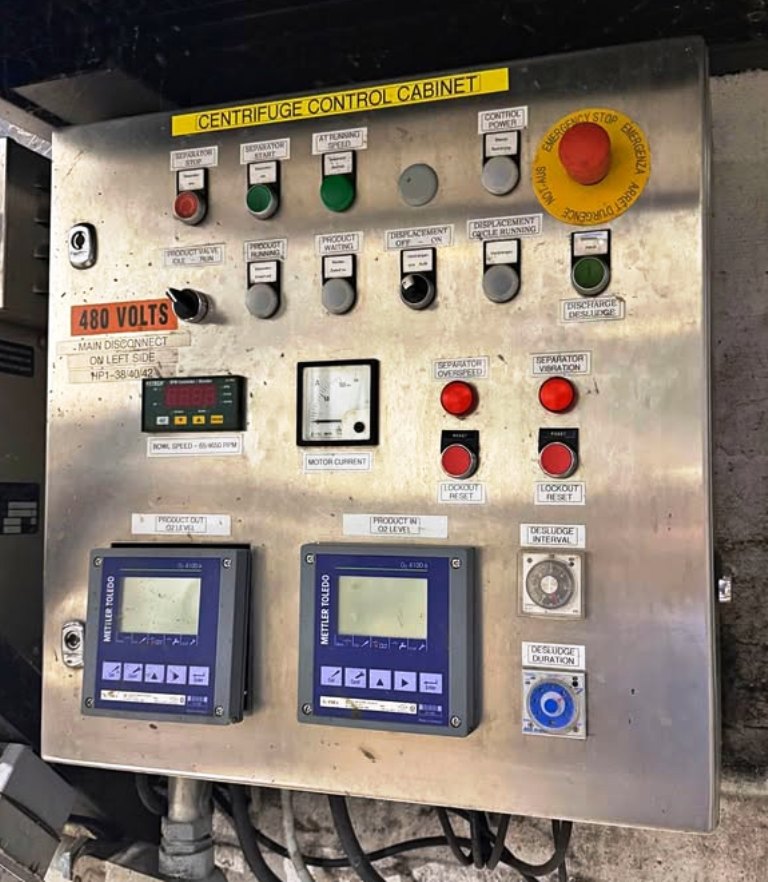Max bowl speed 4650 RPM, rated @ 18,000 LPH, 16L solids volume. 30 HP motor 230/460/3/60/3600 RPM, sludge tank, base frame, tools and control panel. Very good condition.