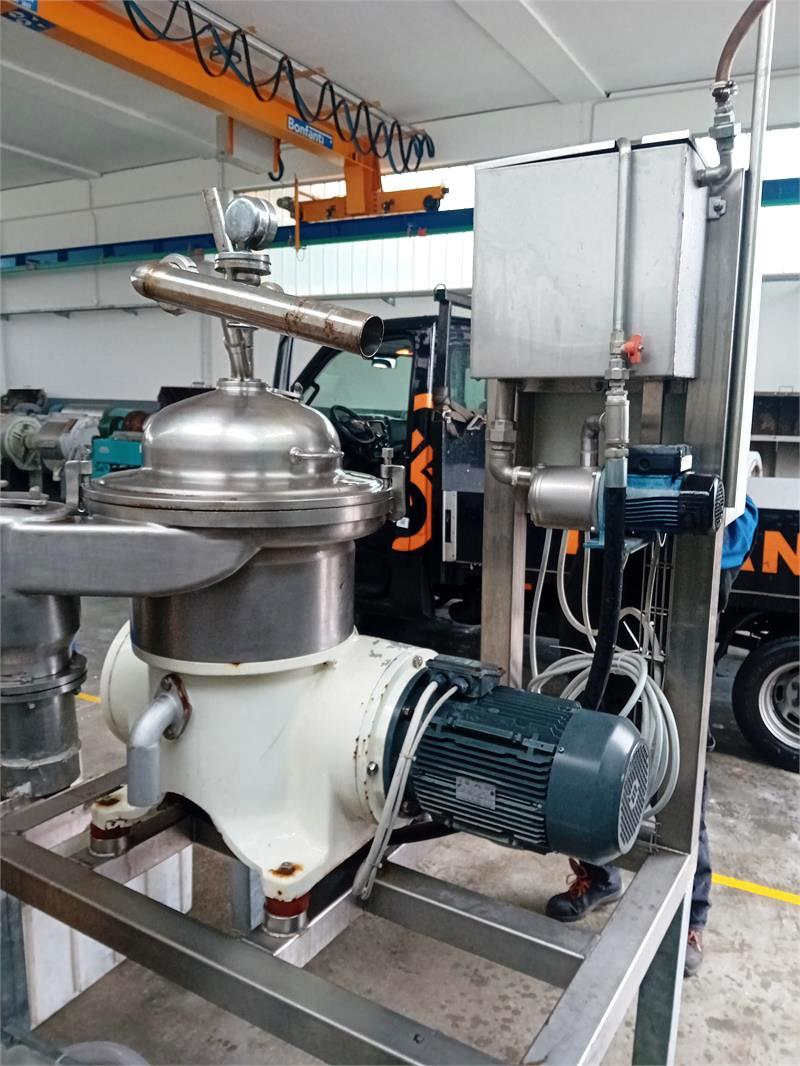 Max bowl speed 7570 RPM, rated @ 4000 LPH. 7.5 KW motor 380/3/50/1450 RPM, sludge tank, flow meter, base frame, water harness, feed pump and control panel, unitized on a SS skid. No tools. Excellent condition. Located in Europe. Equivalent to: SA 14-06-076.