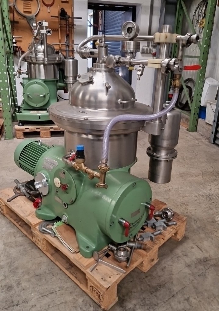 Max bowl speed 7570 RPM, 11,600 x G, rated @ 4000 LPH, self-thinker design. 7.5 KW motor 380/3/50/1450 RPM, sludge cyclone, flow meter, water harness, tools, control panel and manual. Reconditioned to "as new" with one year full mechanical warranty. Located in Europe. Can be mounted on a portable skid: add $5000.