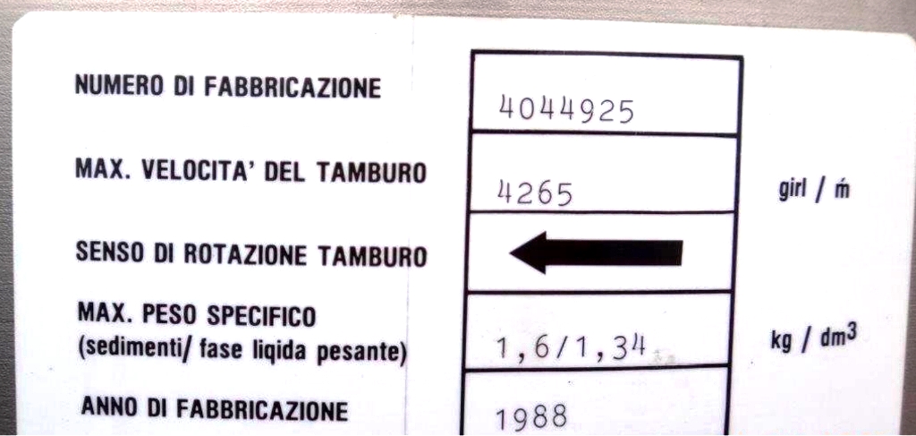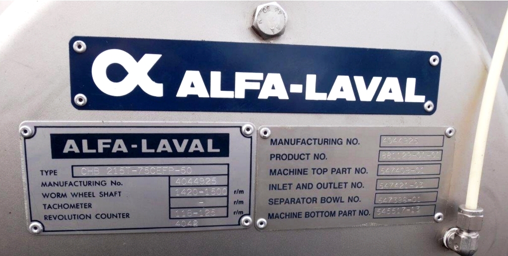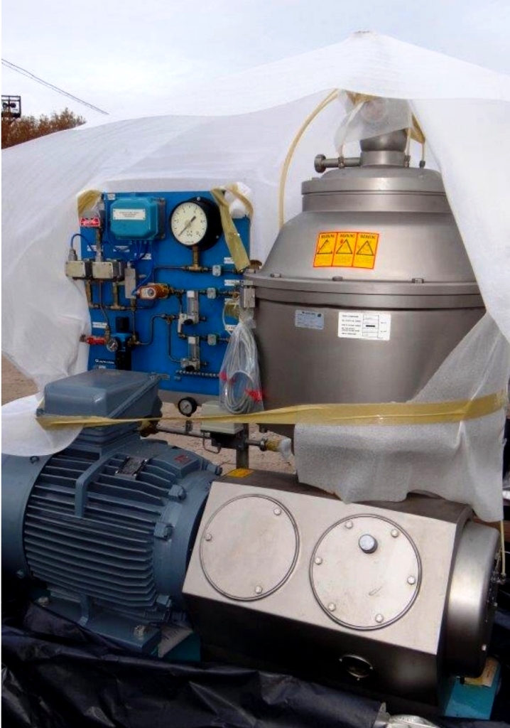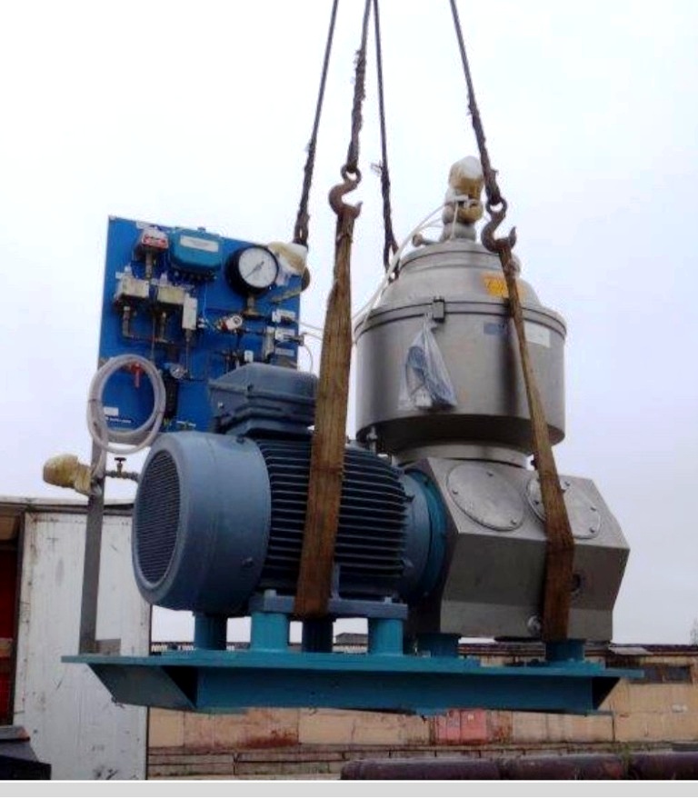 Max bowl speed 4265 RPM, rated @ 60,000 LPH, 30L sludge capacity. Gastight, sparkproof, equipped for inert gas blanketing. Both liquid phases discharged under pressure. 30 KW XP motor 380/3/50/1465 RPM, control panel and tools. 1988 vintage. Very good condition. FCA Russia.