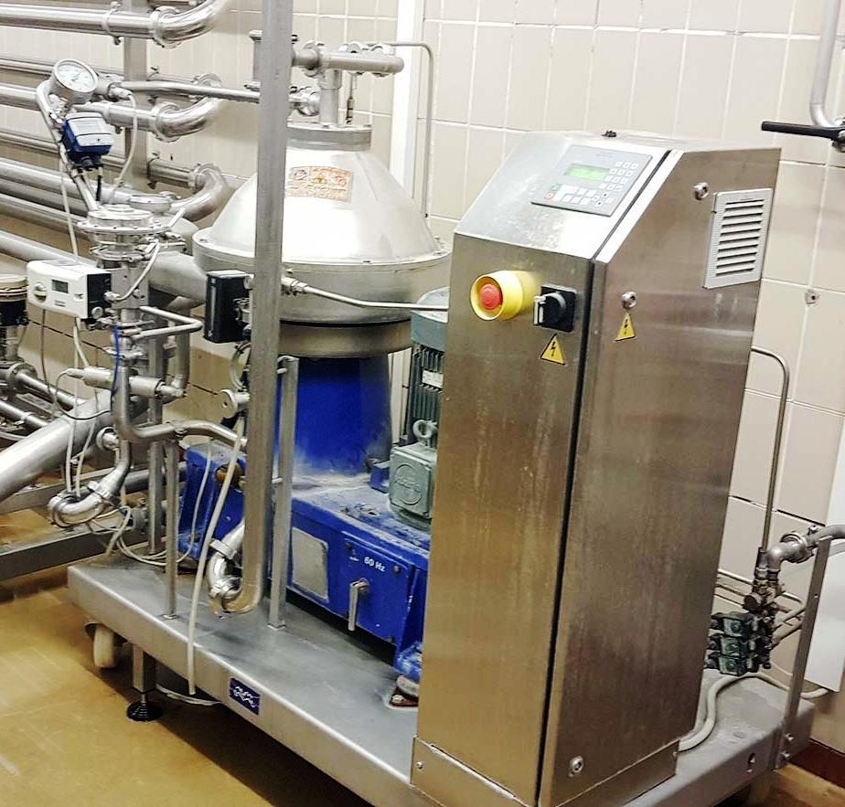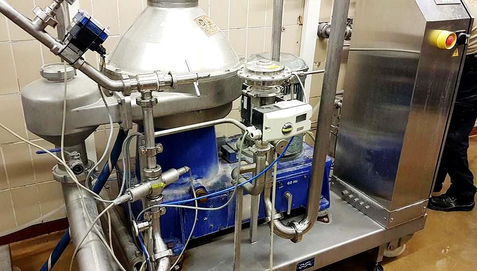 Max bowl speed 8400 RPM, rated @ 9000 LPH, liquid discharged under pressure, 11 KW motor 380/3/50/1450 RPM, valves, piping, feed pump, control panel and tools, unitized on a common portable cart. 2004 vintage. Excellent condition. FCA Europe.