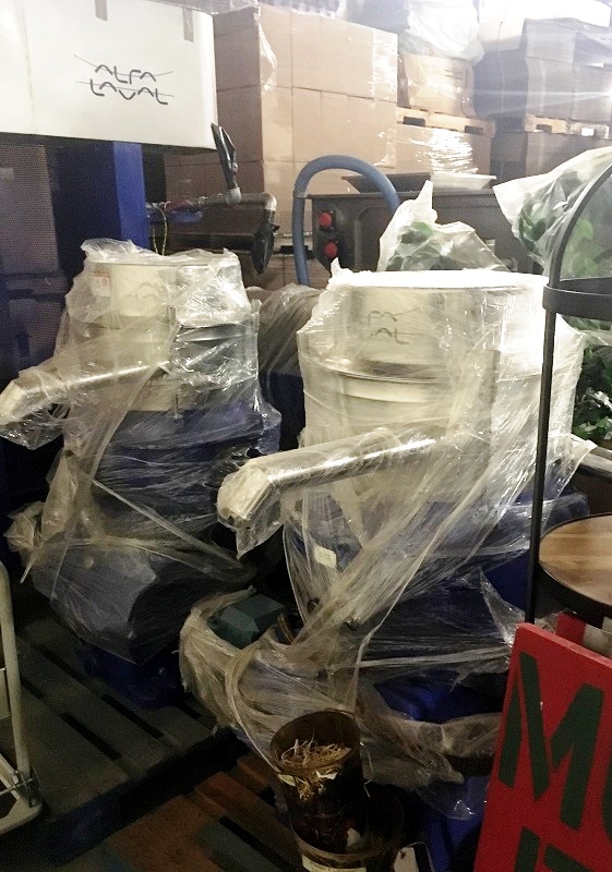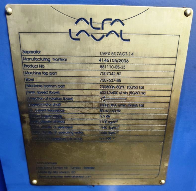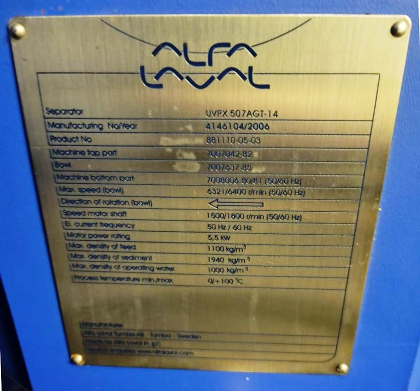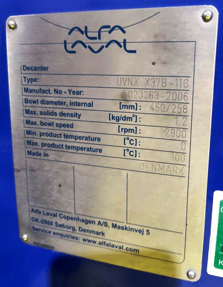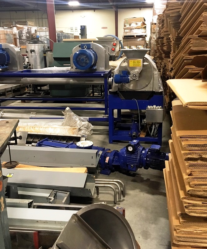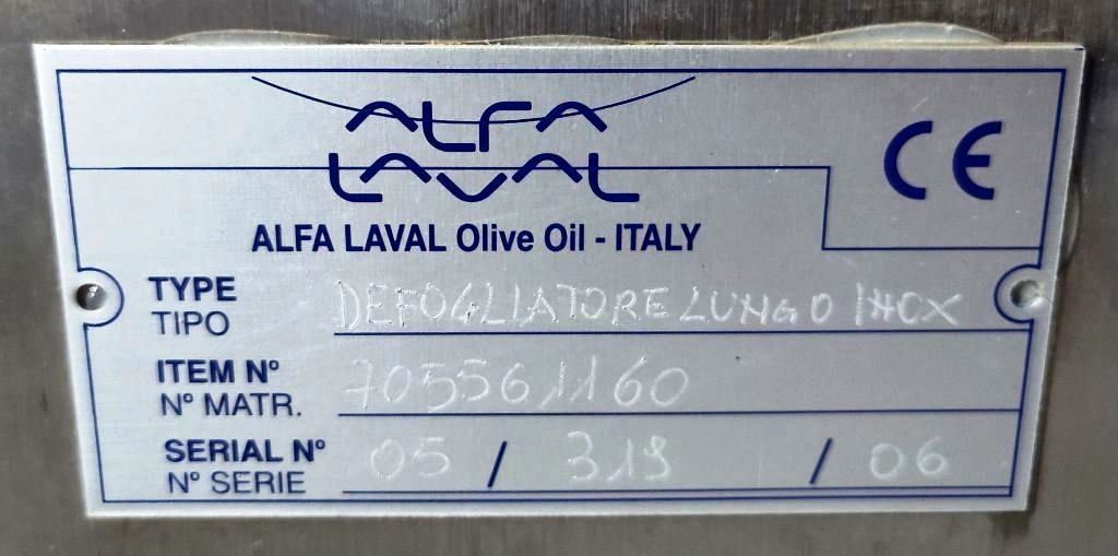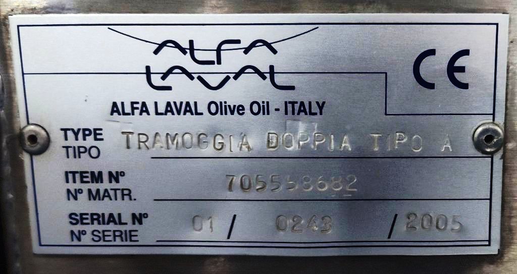 Fully automated plant includes (2) Alfa‑Laval UVPX 507 separators, Alfa‑Laval UVNX 937 decanter centrifuge, (2) hydraulic super washers and destoners with vibrating screens, centrifugal pump, (2) hammer crushers, several screw conveyors, (3) malaxers, (2) depitting machines, Mono feed pumps, 12 x 12 plate and frame heat exchanger, several tanks, motors, piping and controls. 2006 vintage. Excellent condition, stored indoors, only 90 hours of use. New cost: $1.6 M, 15 month delivery.