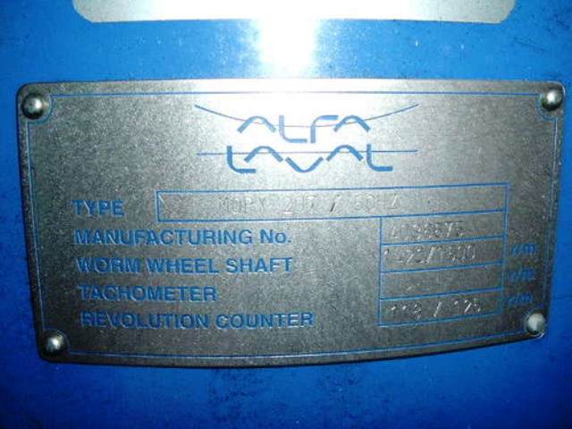 Max bowl speed 6150 RPM, rated @ 20 GPM on lube oil. Light phase discharge under pressure, heavy phase by gravity, 5.5 KW motor 380/3/60/1450 RPM, gravity discs, tools and manual. 2005 vintage. Excellent condition. FCA NZ.