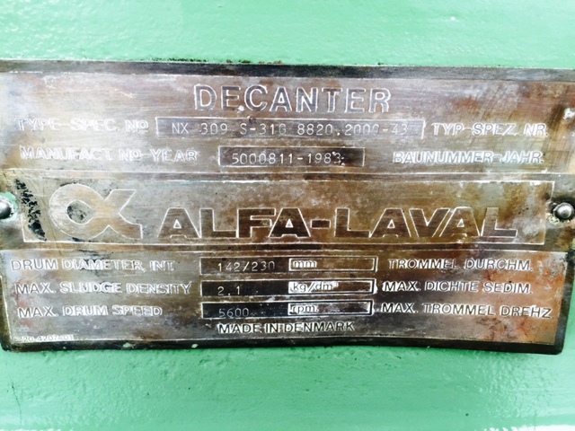Max bowl speed 5600 RPM, 4000 x G, 9.2 x 27.6", pump on liquid discharge, 3.5" double lead hardsurfaced conveyor 15 KW motor 220/380/3/50/2910 RPM, cake vibrator, 25:1 cyclo gearbox, feed tube, guards and vibration isolators. 1983 vintage. Excellent condition. FCA India.