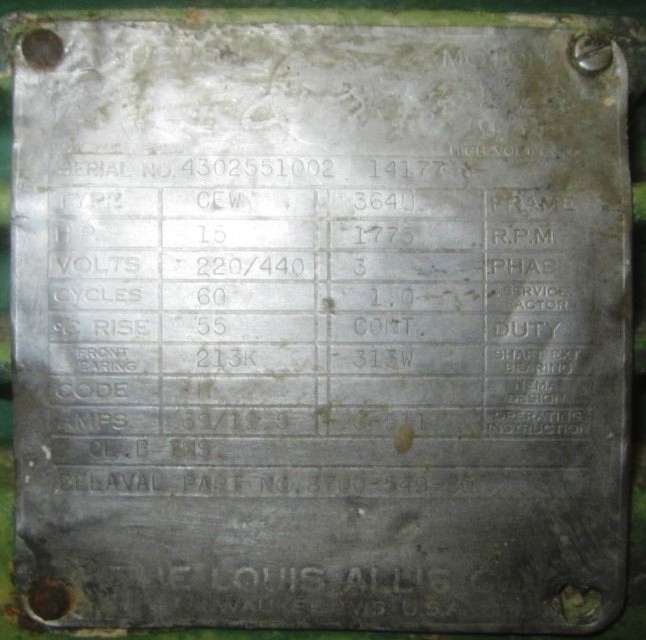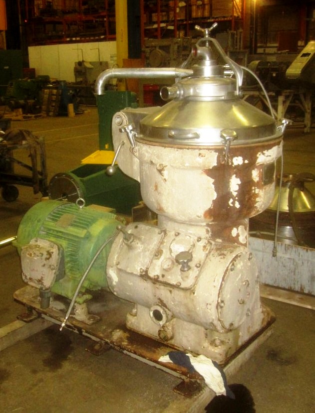 Max bowl speed 4500 RPM, rated @ 12,000 LPH re-refining. 15 HP motor 230/460/3/60/1750 RPM and lock ring tool. Very good condition.