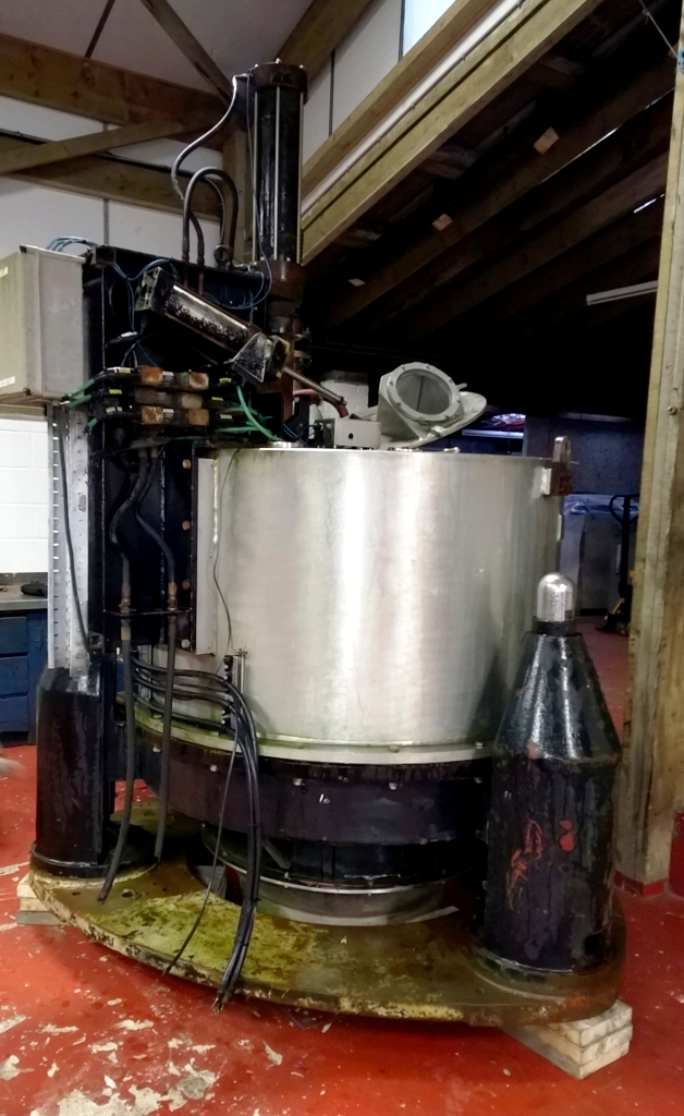 Max bowl speed 1050 RPM, 770 x G, bottom dump, 1250 x 710mm basket ID, max load 500 kg. 22 KW XP motor 380/3/50/2900 RPM, double-motion plow, feed/rinse tube and control panel. 1997 vintage. Reconditioned to "as new." FCA UK.