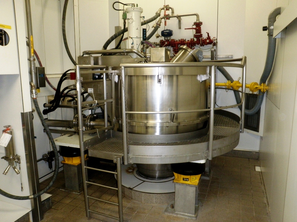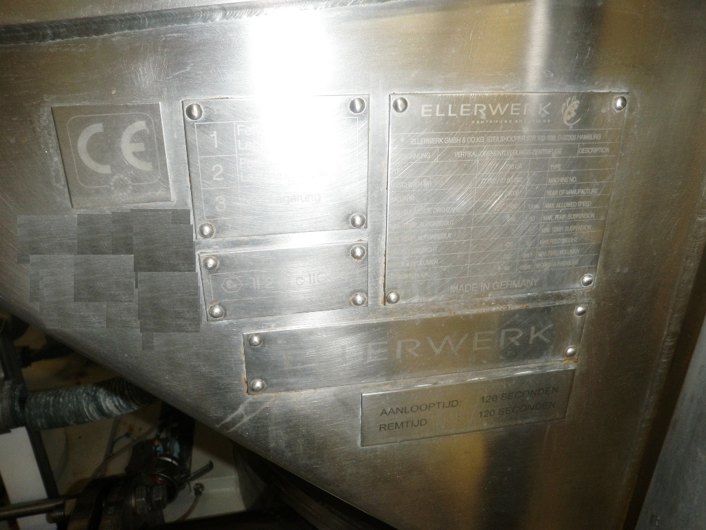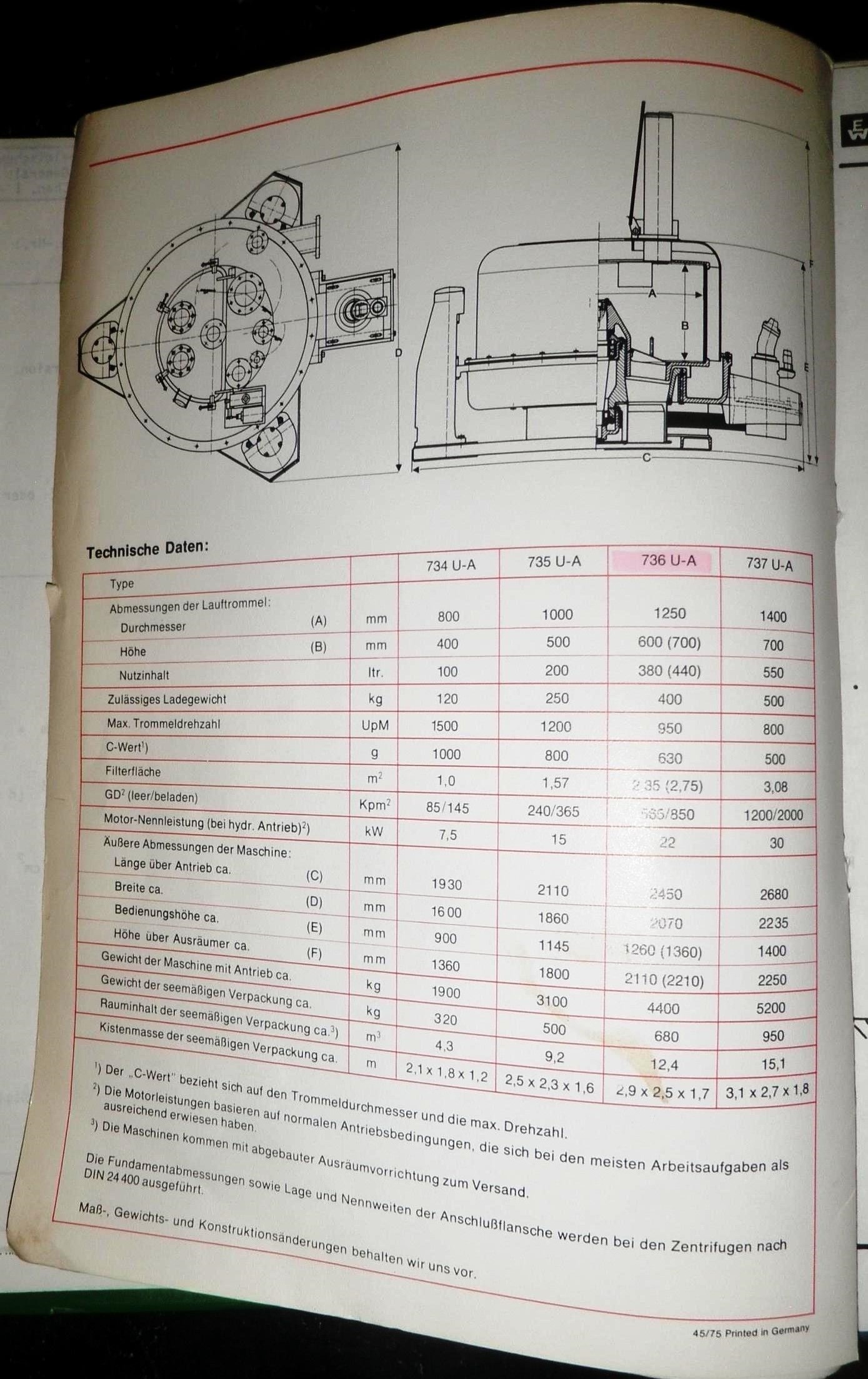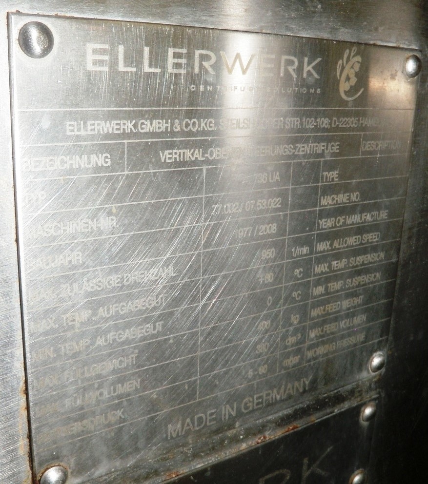 Max bowl speed 950 RPM, 630 x G, 1250 x 600mm basket ID, max load 400 kg, 2.35 sqM filtration area, hinged top cover, plow, 22 KW hydraulic motor 380/3/50/1450 RPM, feed and rinse pipes, sight glass, bottom drain and control panel. 1977 vintage, controls upgraded in 2008. Excellent condition. FCA Europe.