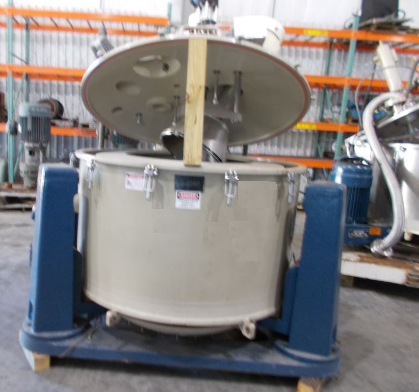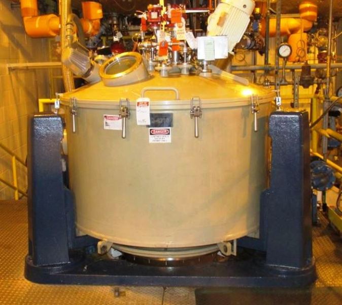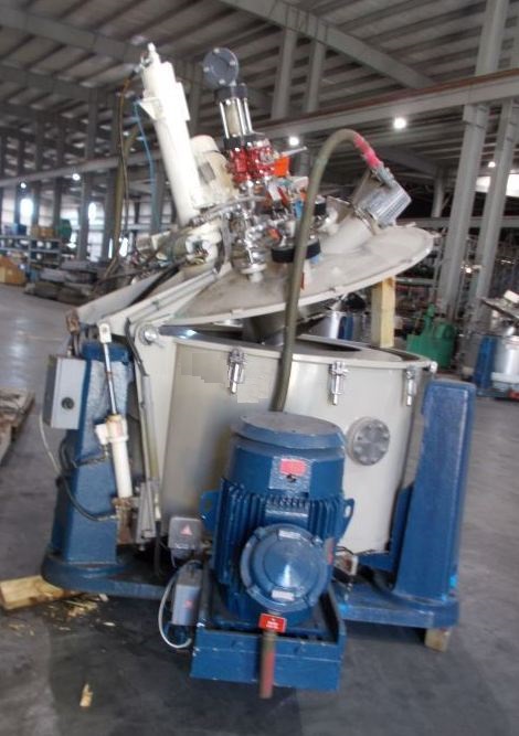 Cone is Hastelloy C-22, basket is Halar-coated SS. Max bowl speed 950 RPM, 630 x G, bottom dump, gastight, 26.5 sqft filtration area, 500 kg max load, 104 G volume, nitrogen purge, GMP/FDA approved sanitary design. 18.5 KW motor 460/3/60/1750 RPM, pneumatic heel cake removal feature, CIP spray balls, hydraulic power pack for lid lifting, feed pipe and sight glass. Prior use: Pharmaceutical. Excellent condition.