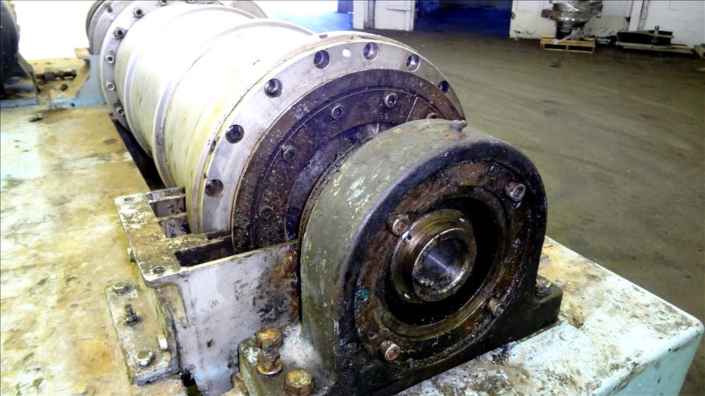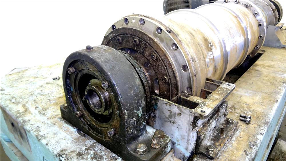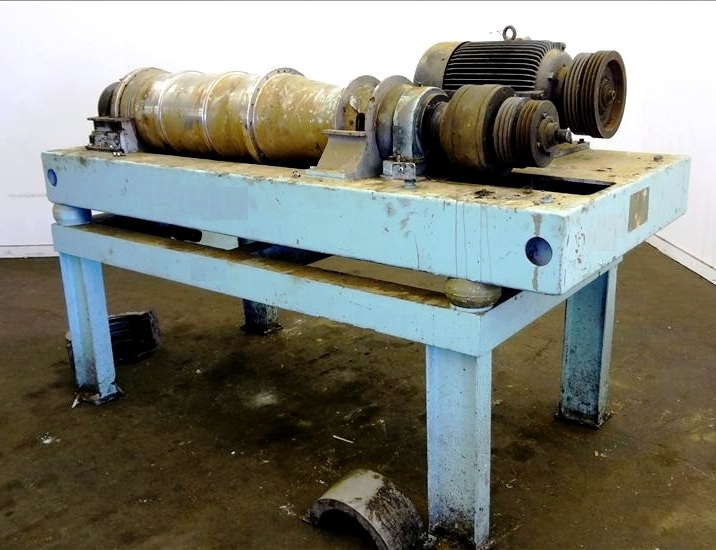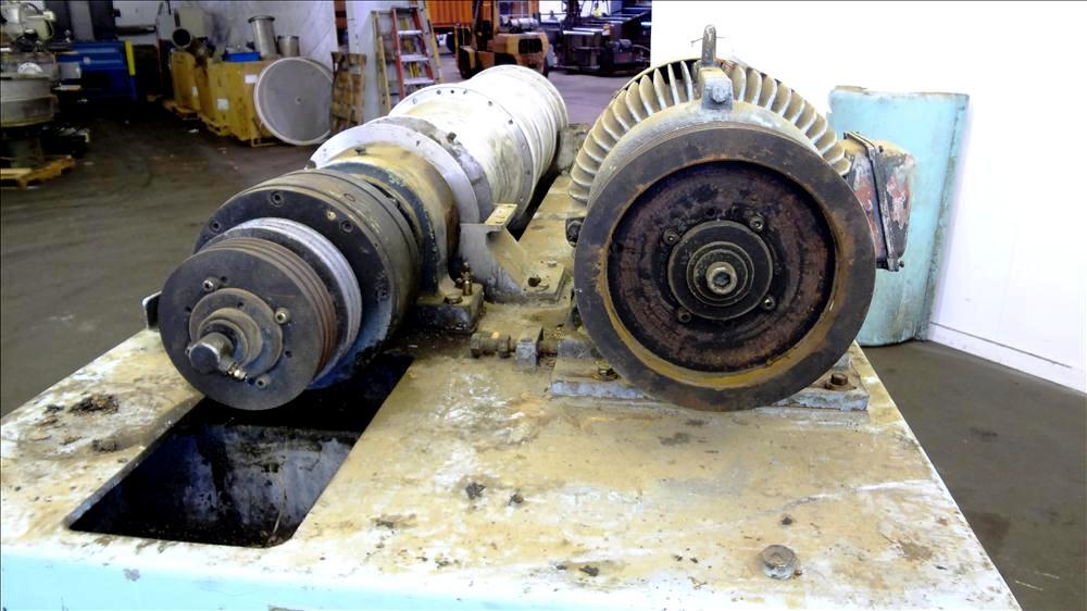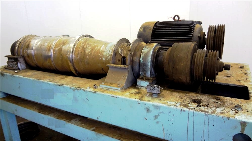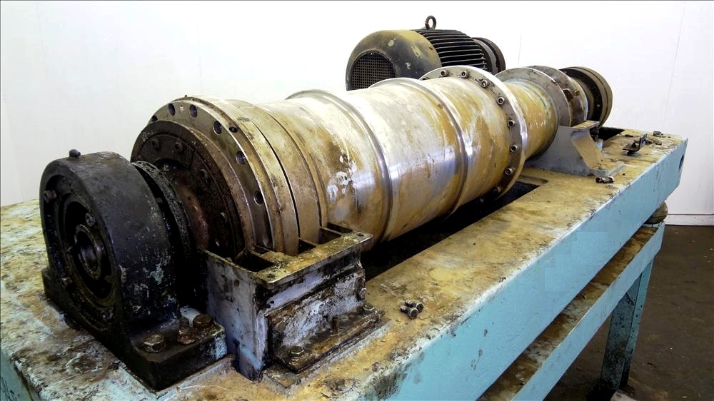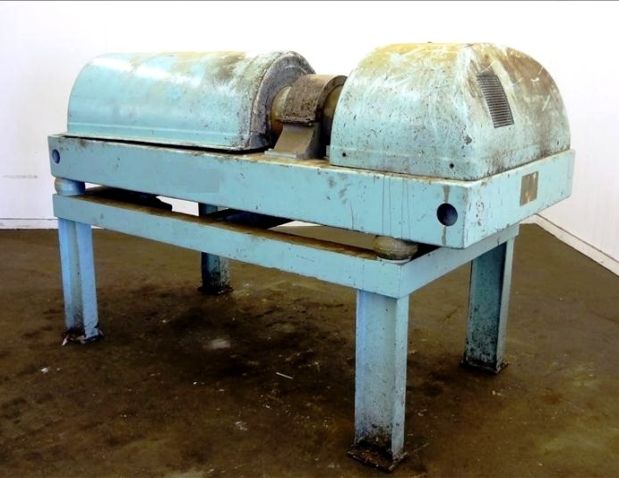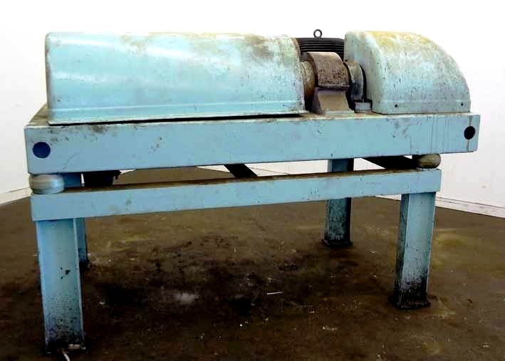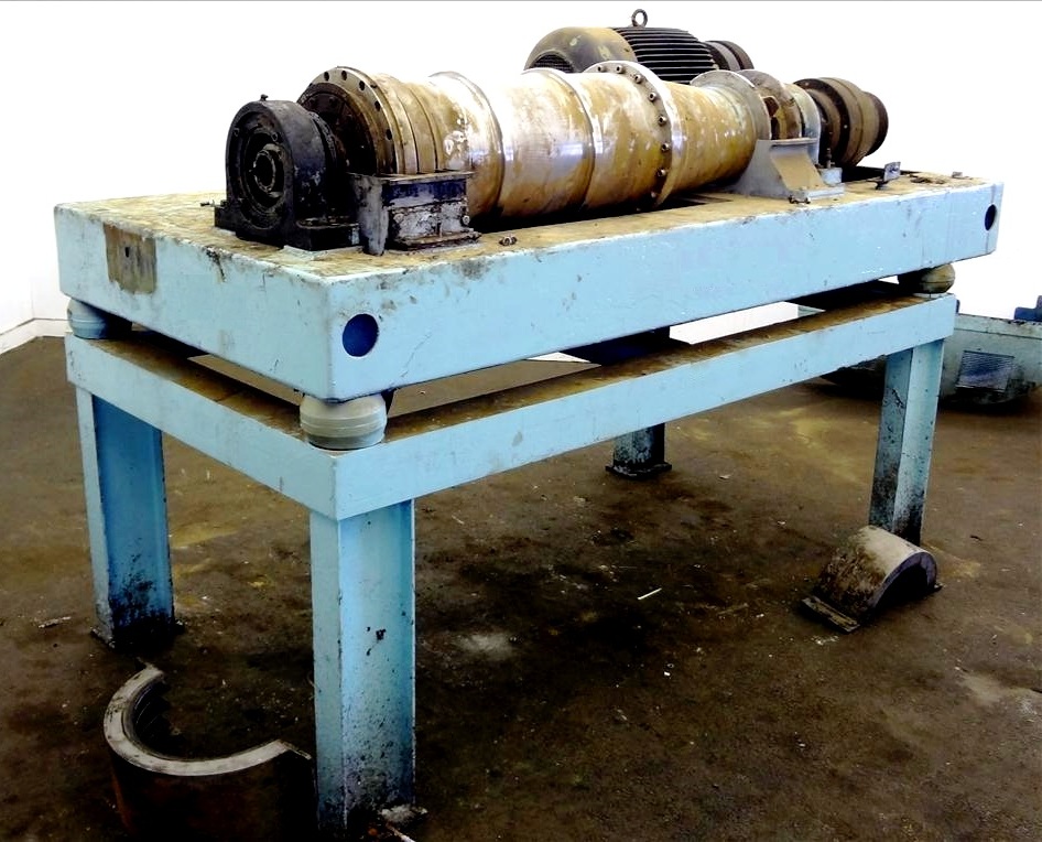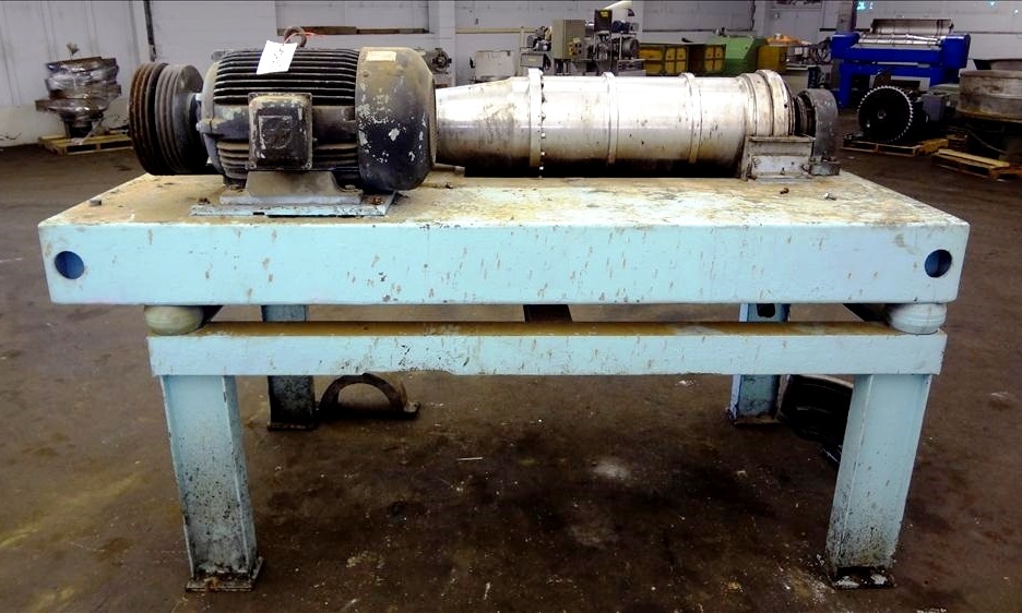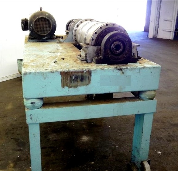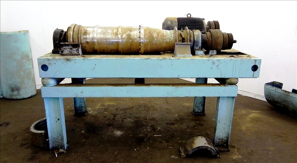 Max bowl speed 4000 RPM, 3750 G's, adjustable weir/arm. 3" single lead TC spray conveyor, 22 KW motor 380/3/50, gearbox, lube system, feed tube & guards. 1986 vintage. Very good condition.