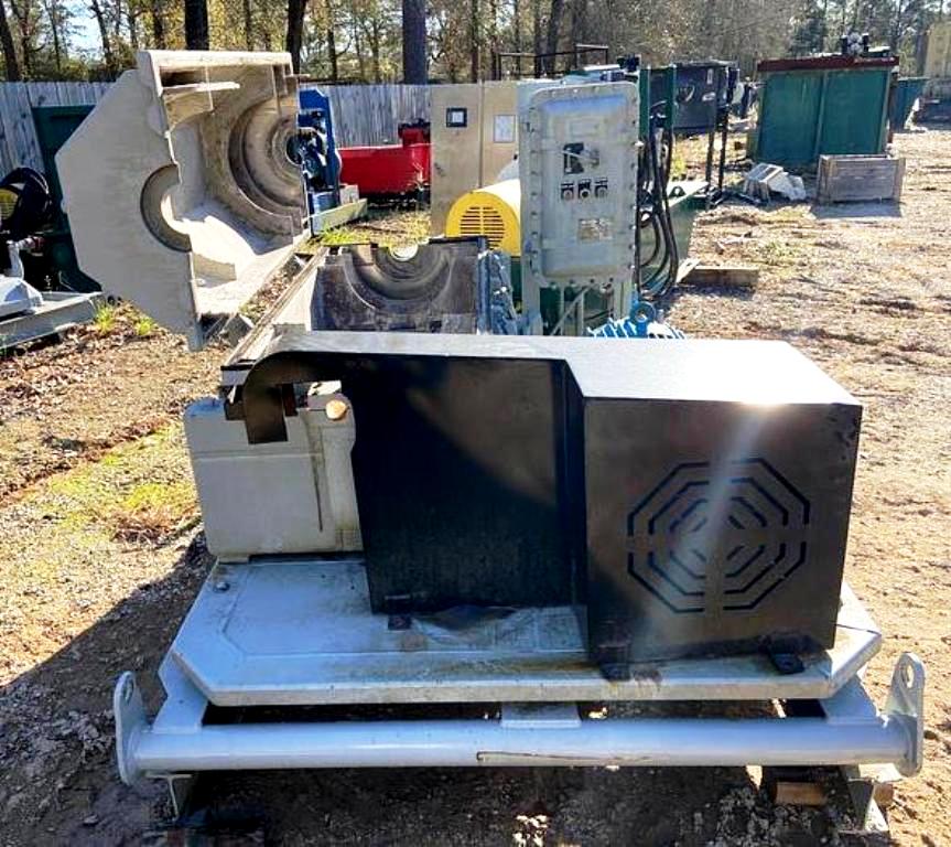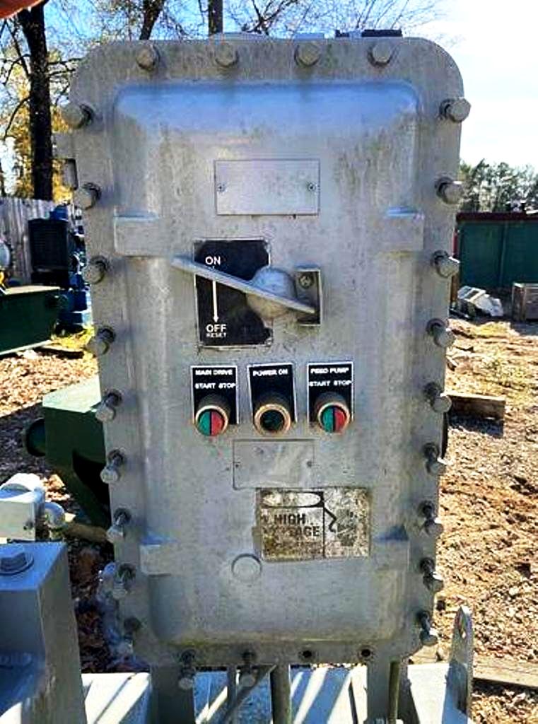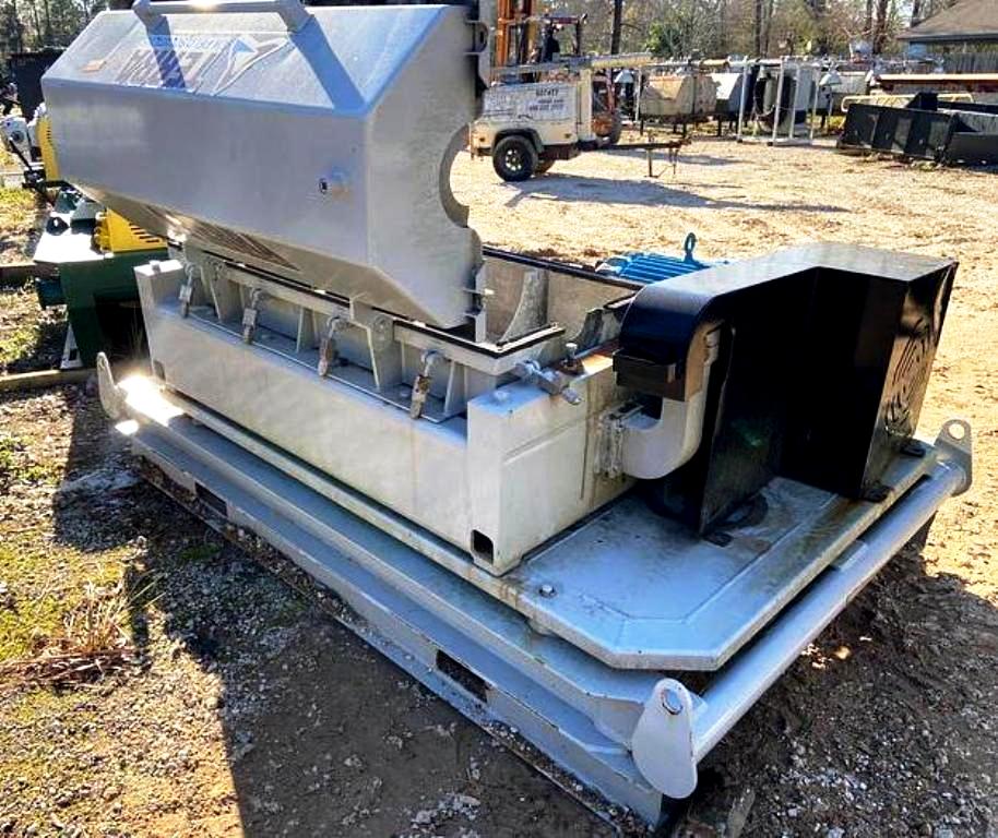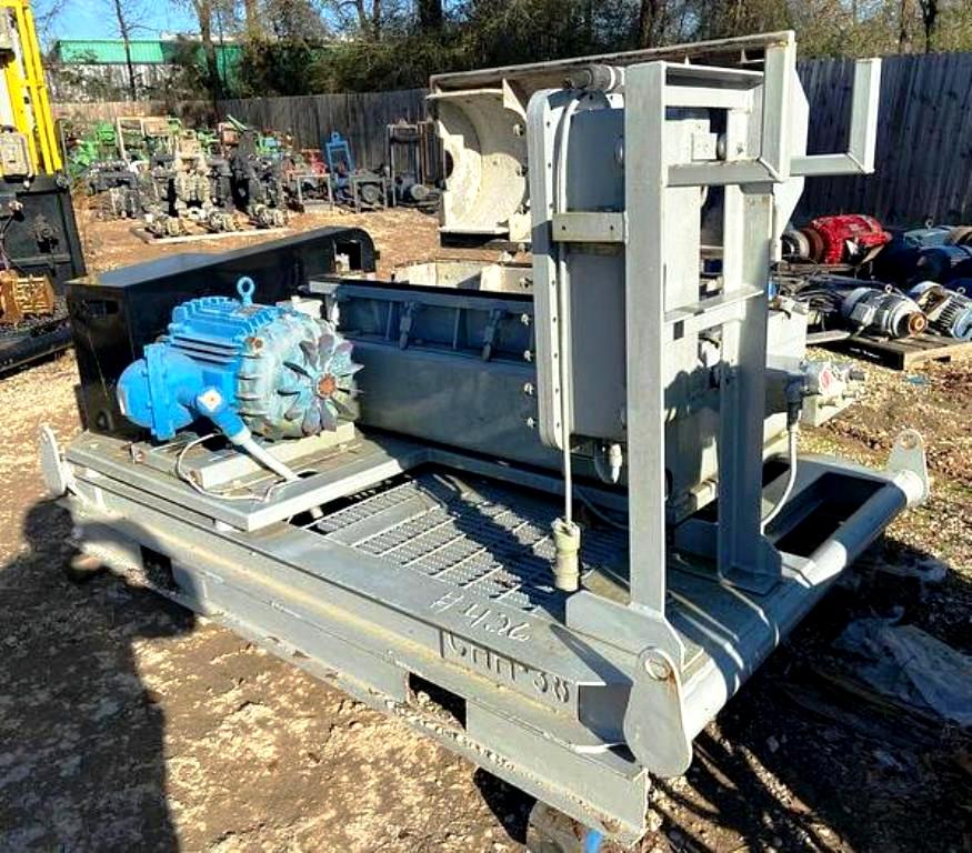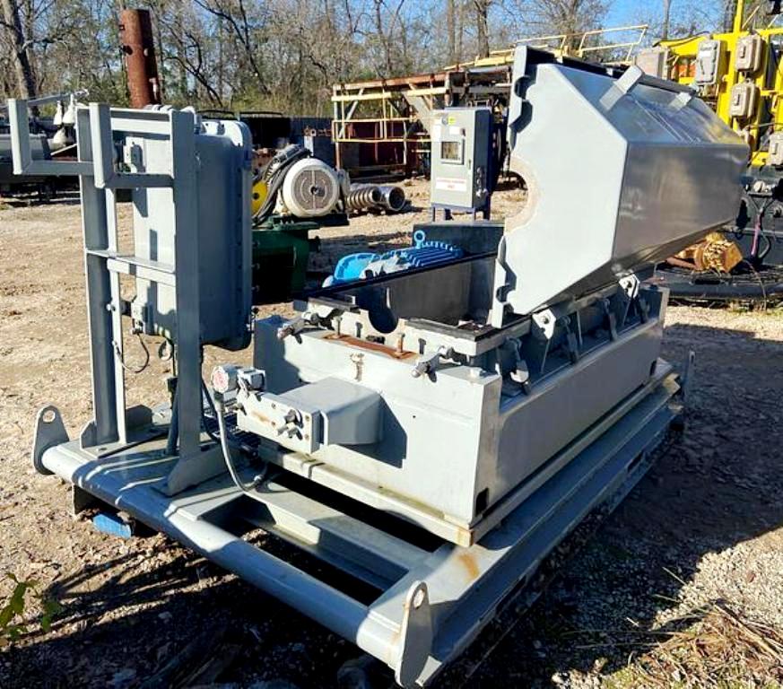 Max bowl speed 3700 RPM, adjustable liquid ports, hogged-out cake ports with wear liners and flingers. 4.25" single lead STC tiled conveyor, 50 HP XP motor 460/3/60/1750 RPM, 15 HP backdrive, 52:1 gearbox, feed tube, guards, vibration switch/isolators and XP control panel, unitized on oilfield skid. Very good condition.