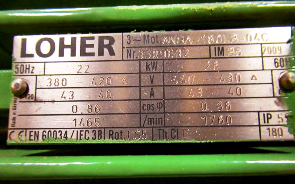 Loehr 22 KW 380-420/3/50/1465 RPM, 26 HP 440-480/3/60/1760 RPM.