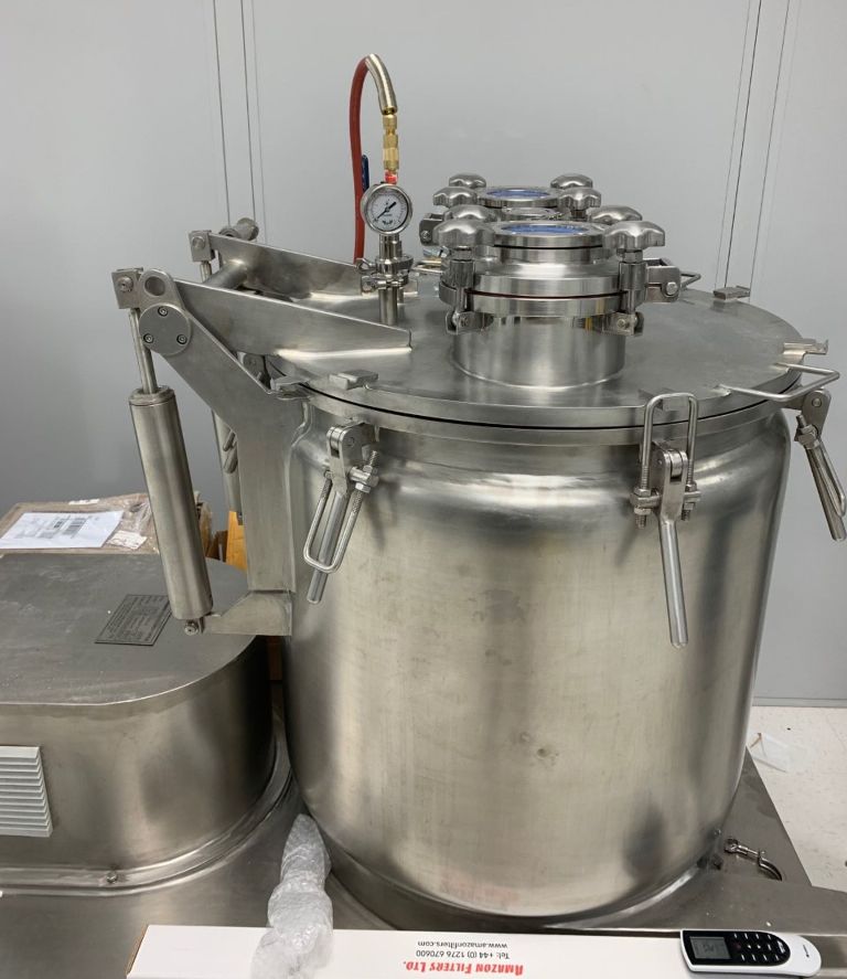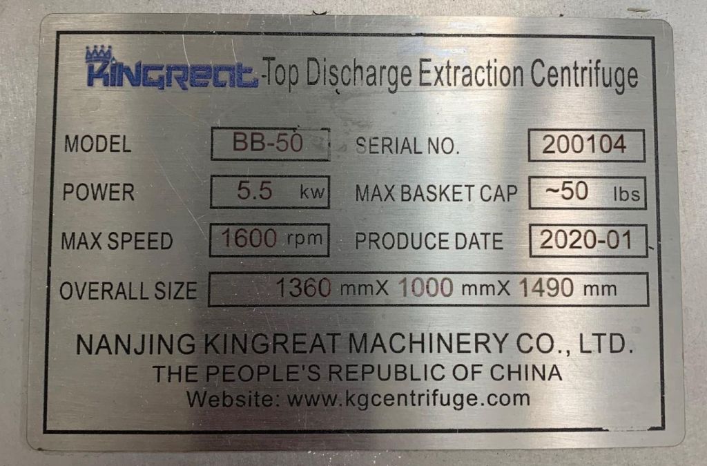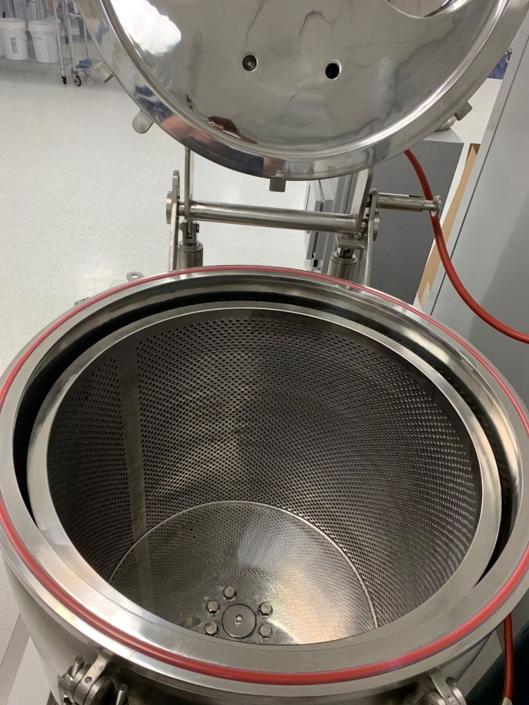 Max bowl speed 1600 RPM, rated @ 50 LB biomass per batch, low temp -80C max, vacuum jacketed insulation layer, 5.5 KW XP motor 460/3/60 with VFD, reinforced sight glass, tri-clamp fitting for feed and drain ports, touch screen HMI control panel, unitized on a skid with vibration isolators, spare parts and manual. 2000 vintage. Never used.