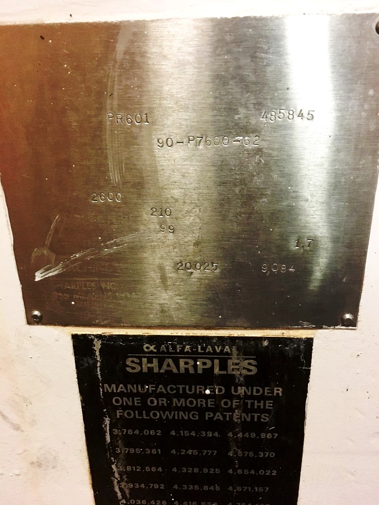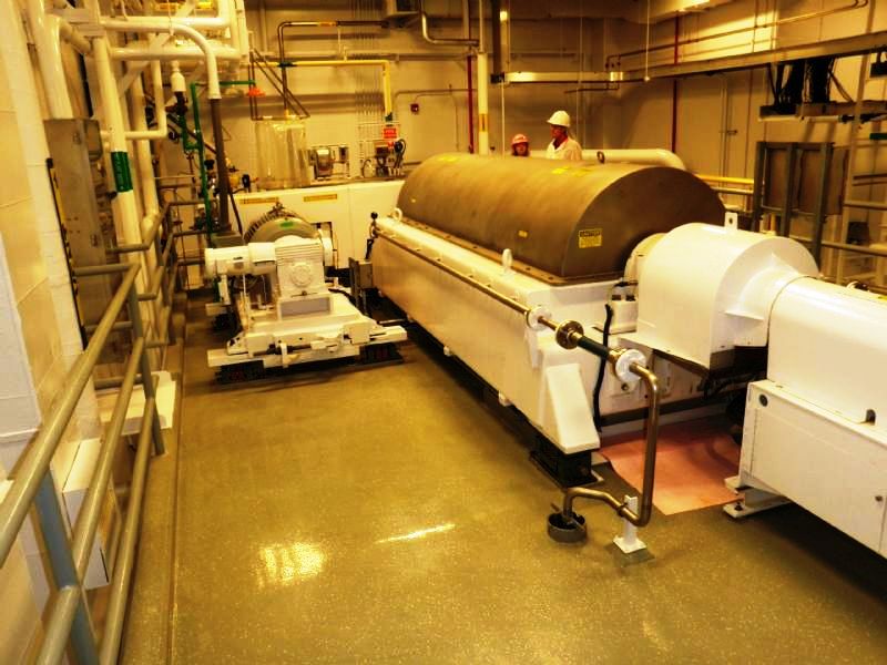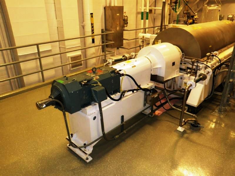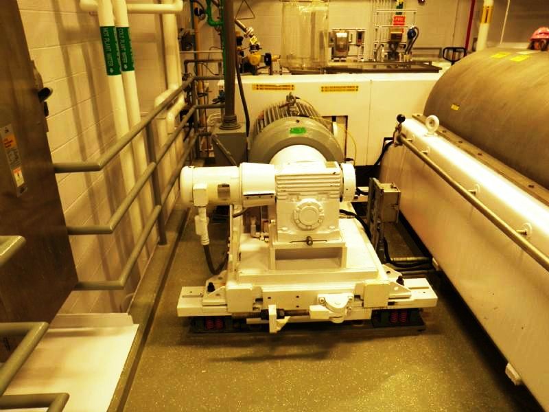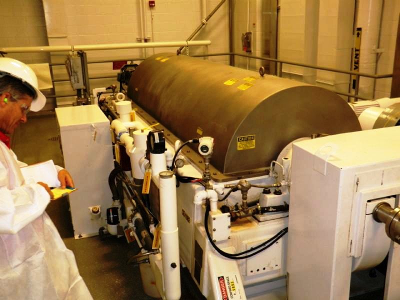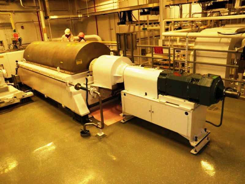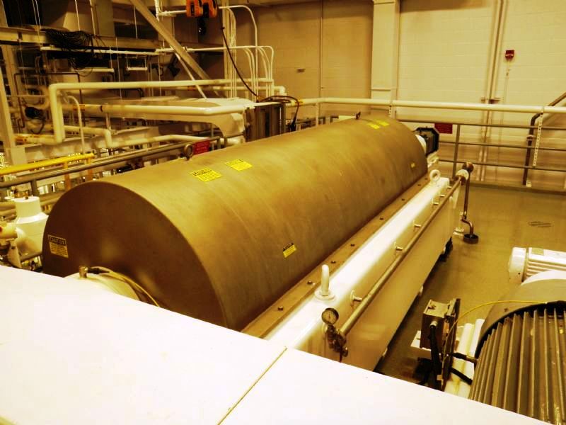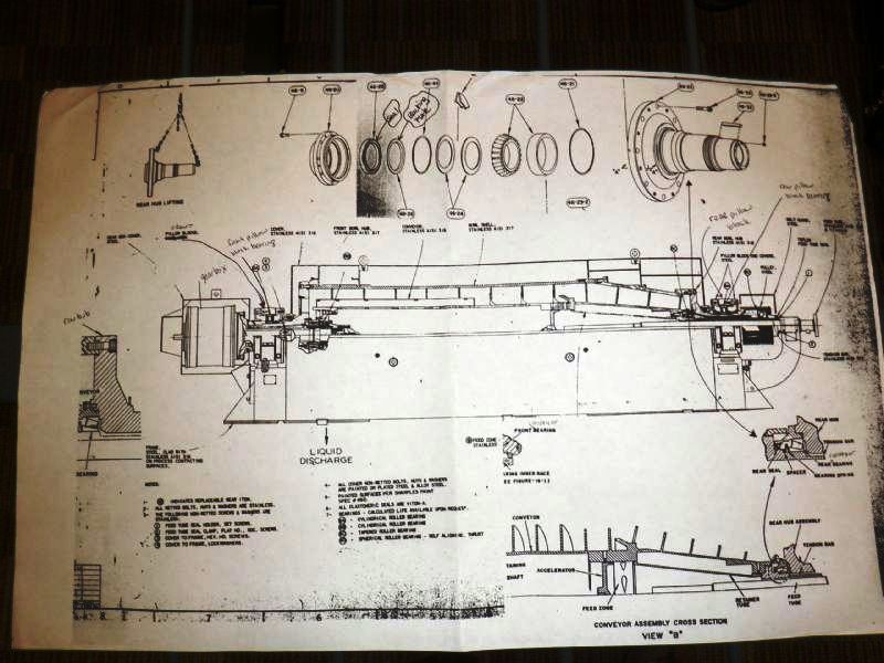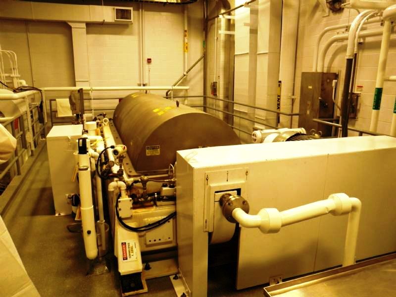 Max bowl speed 2600 RPM, 2780 G's, 360 degree cake dis- charge, 10" single lead conveyor with STC tiles & STC feed zone, half-moon plate dams, SS casings & chutes, feed tube, 95:1 gearbox, lube system, 100 HP motor 460/ 3/60/1790 RPM, 25 HP DC backdrive & stand, vibration switch, guards, control panels & manuals. 1990 vintage. includes spare bowl. Very good condition.