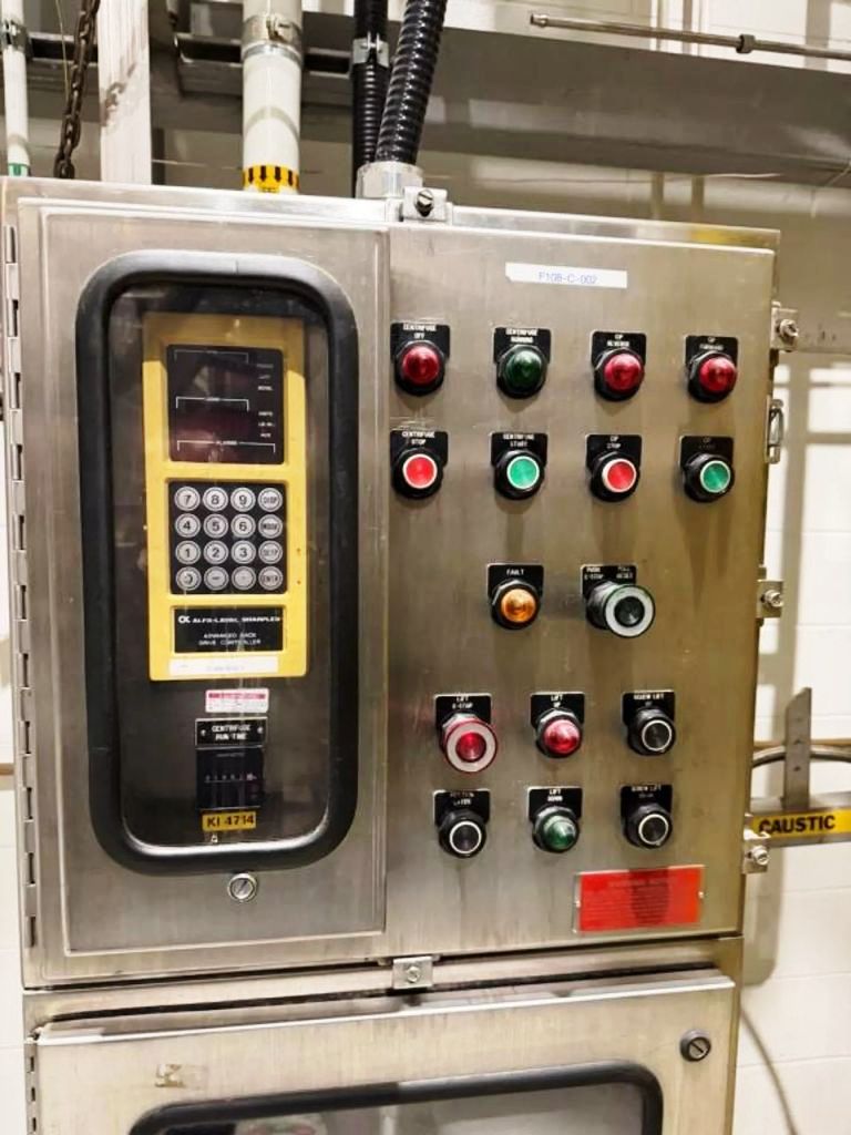 Max bowl speed 9000 RPM, 10,000 x G, sanitary design, cooling jacket, CIP/SIP to 15 PSIG @ 260F, full containment for handling biological or sterile slurry, 10 HP XP main drive and 1 HP XP backdrive with PLC starter and controls. 1992 vintage. Excellent condition.