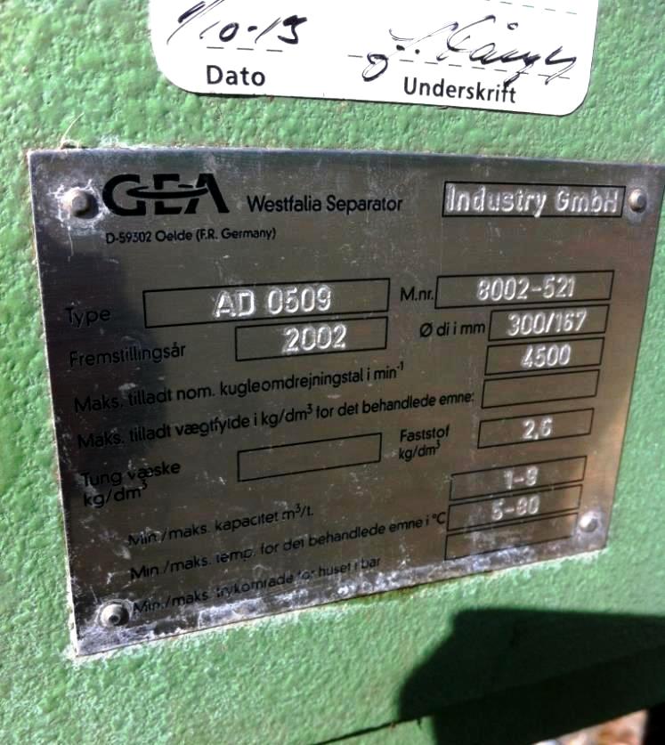 Max bowl speed 4500 RPM, 3400 G's, rated @ 25 GPM, gravity discharge design, 4" single lead hardsurfaced conveyor, 15 KW motor 220/380/3/50, gearbox, 2.2 KW BD, guards, feed tube and chutes on integrated stand with control panel. Very good condition. 2002 vintage. Equivalent to UCD 305 (300 x 1200mm bowl; 11.8 x 47.2")