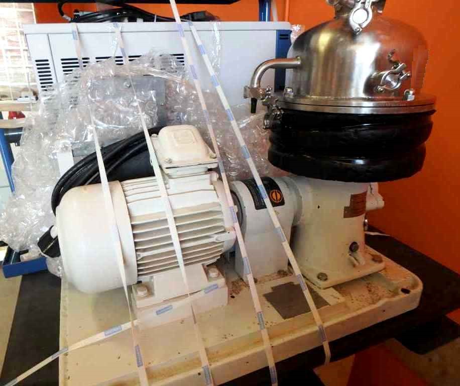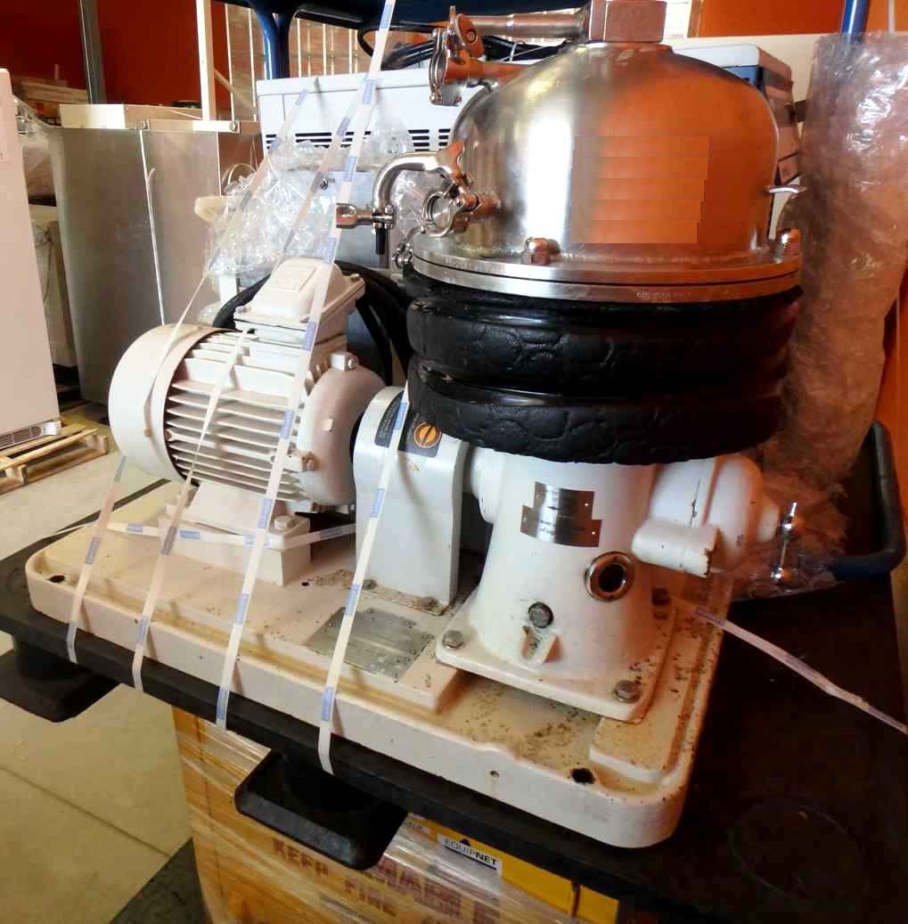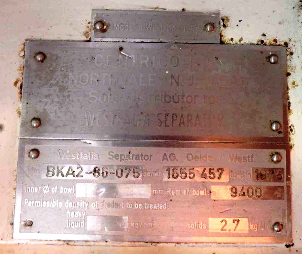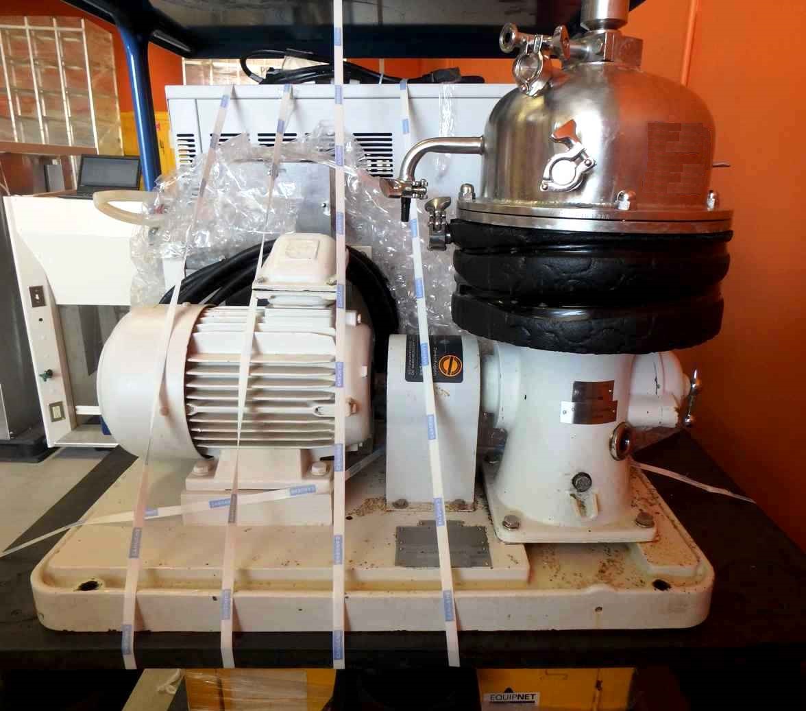Max bowl speed 9400 RPM, solid capacity 2.7 KG, liquid discharged under pressure, 1 HP motor with plug 115/1/60, jacketed cooling covers, tools and control panel. Unitized on a common base. Excellent condition. 1975 vintage.
