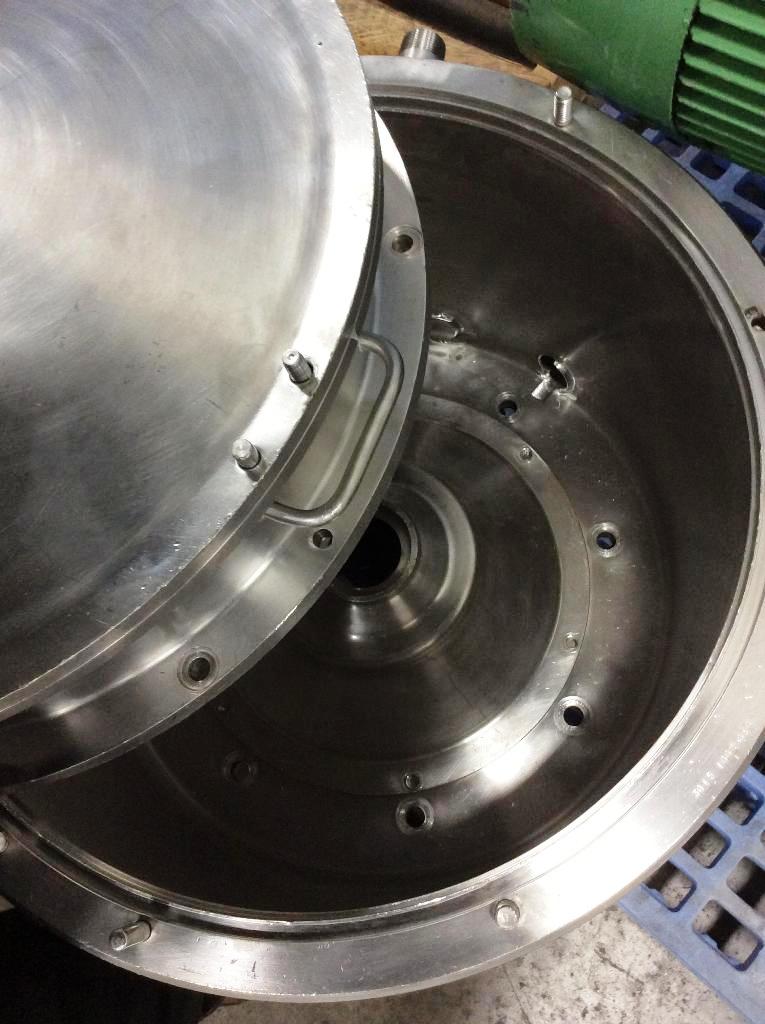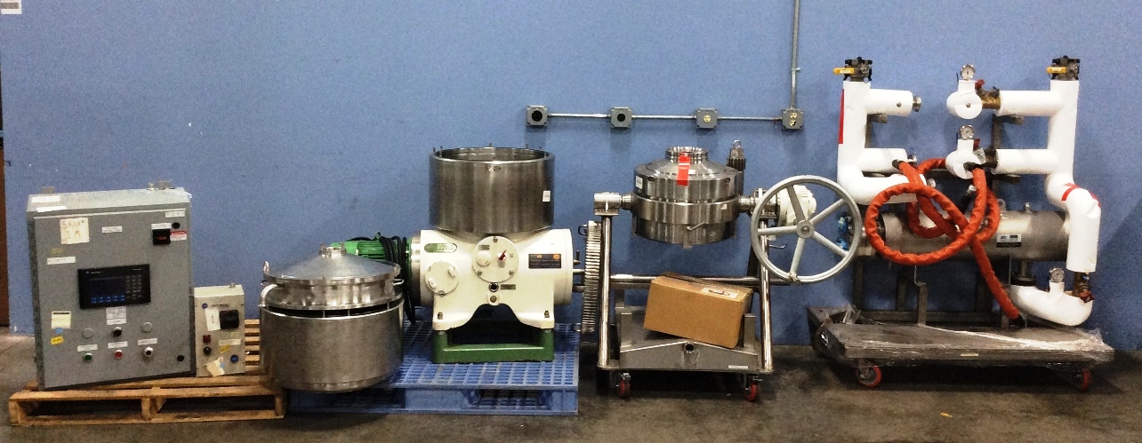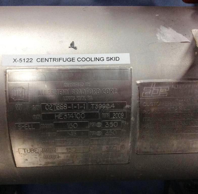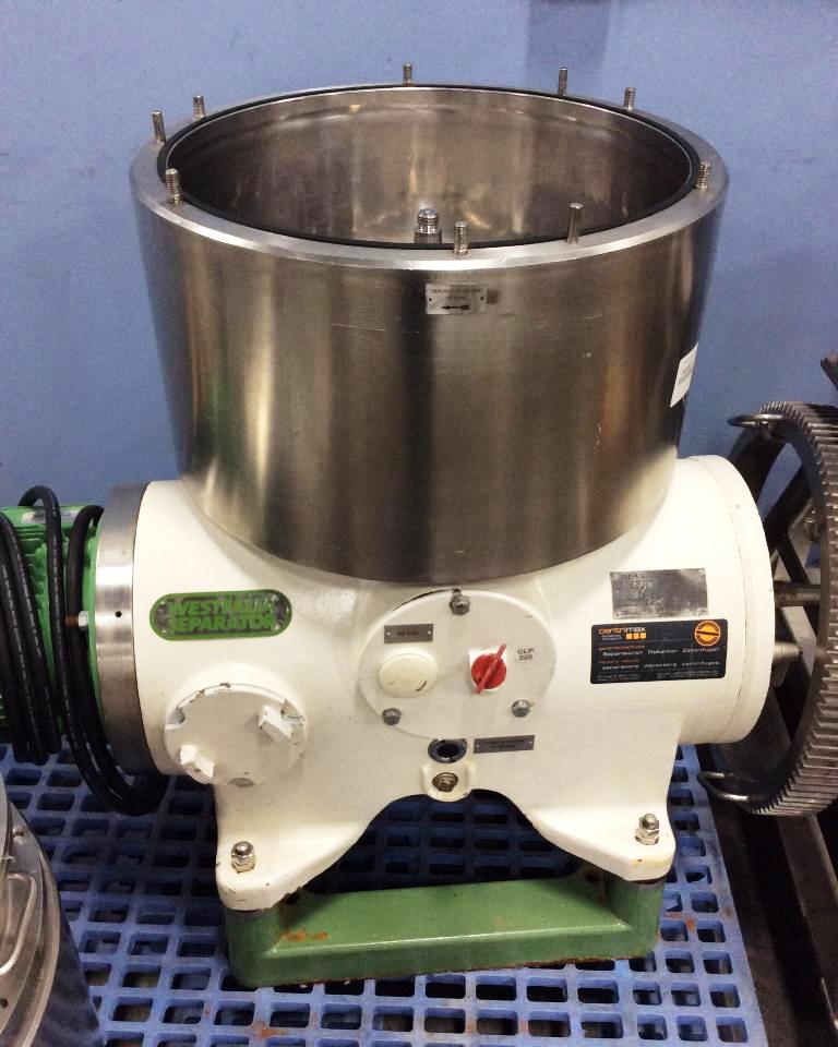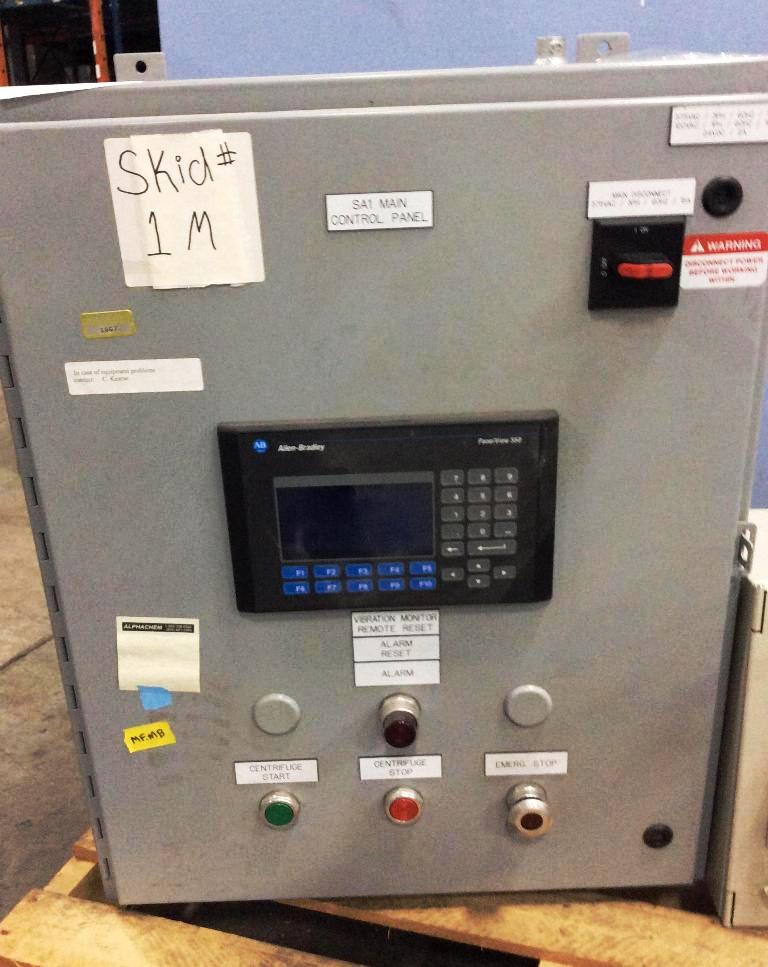 Max bowl speed 6600 RPM, solids capacity 25 liters, liquid discharged under under pressure, jacketed casing, 15 HP motor 460/3/60/1750 RPM, Allegheny cooling skid, custom cleaning skid and control panel. Excellent condition.
