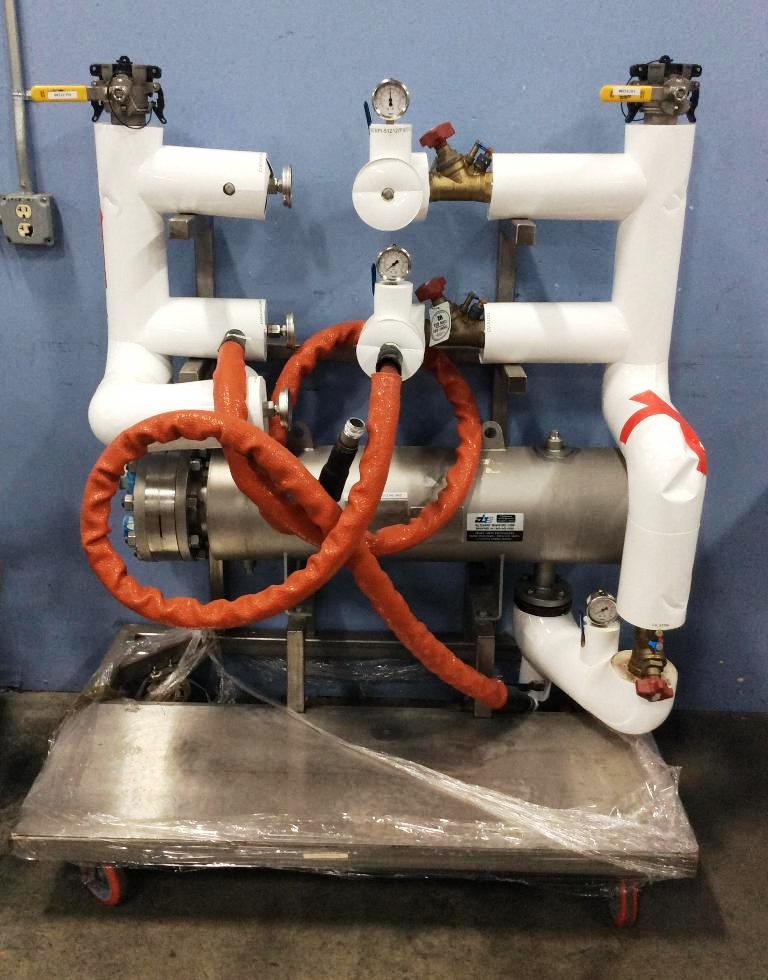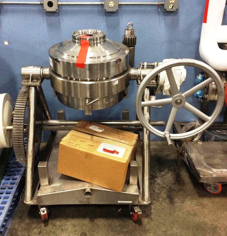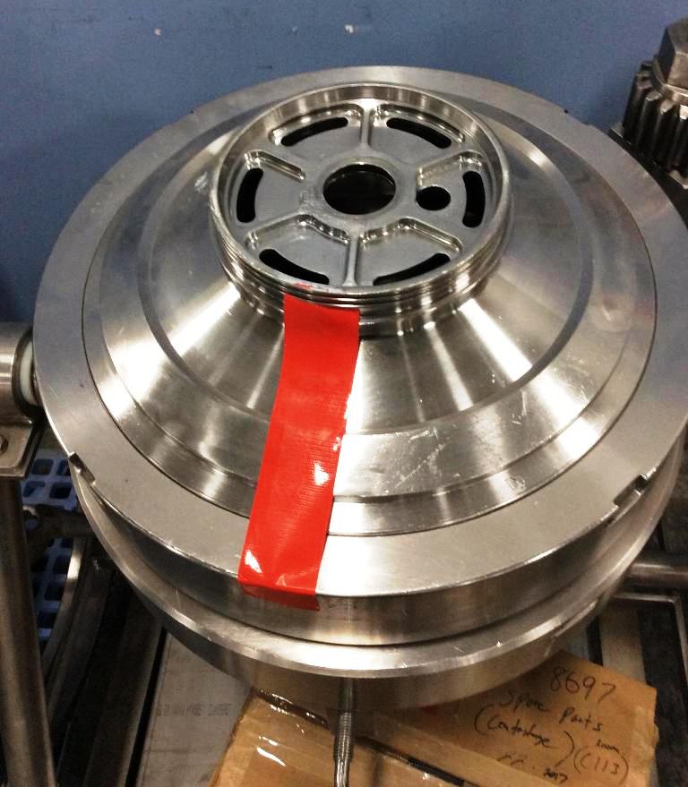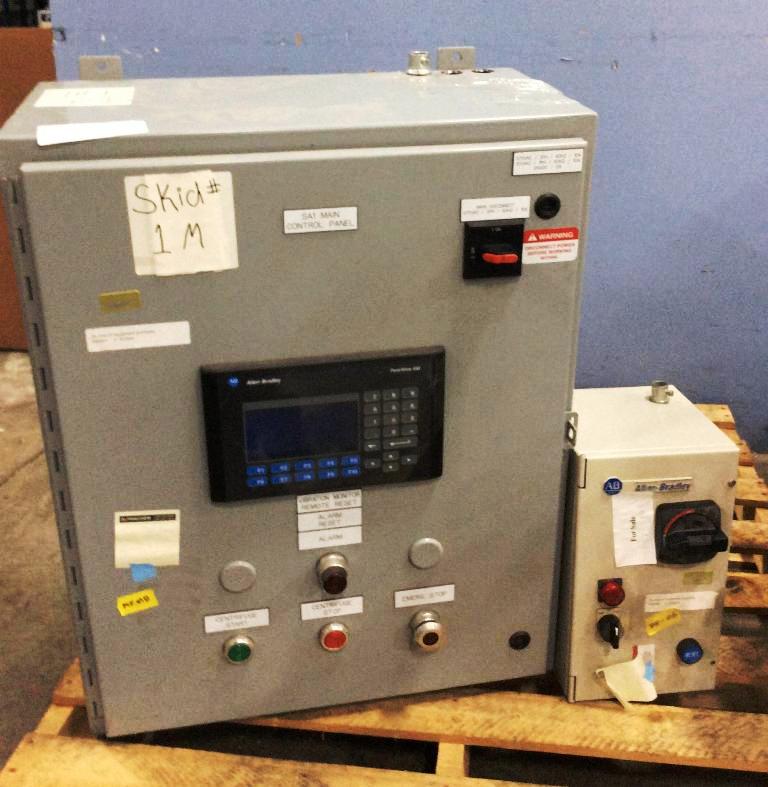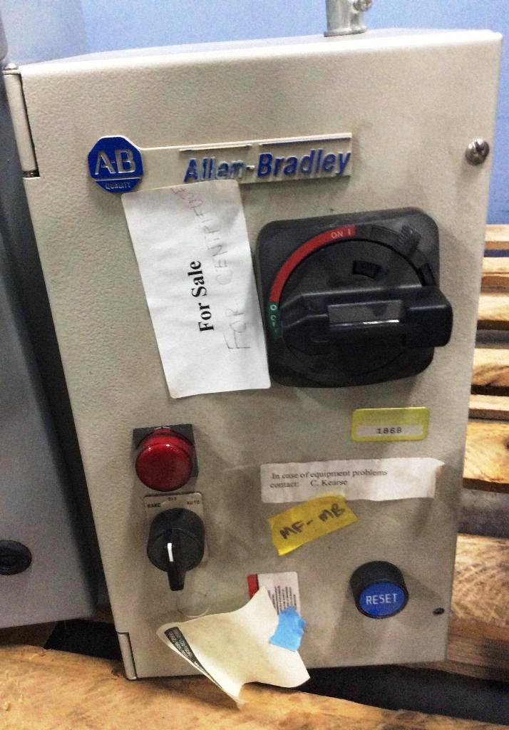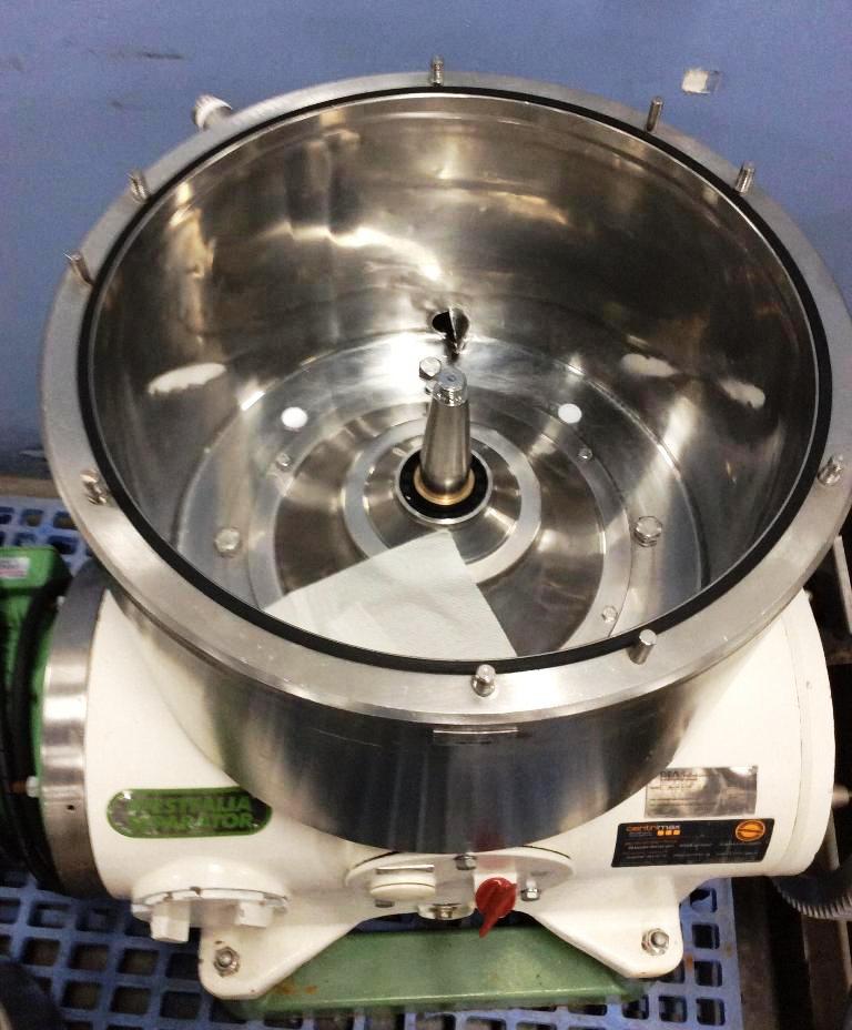 Max bowl speed 6600 RPM, solids capacity 25 liters, liquid discharged under under pressure, jacketed casing, 15 HP motor 460/3/60/1750 RPM, Allegheny cooling skid, custom cleaning skid and control panel. Excellent condition.